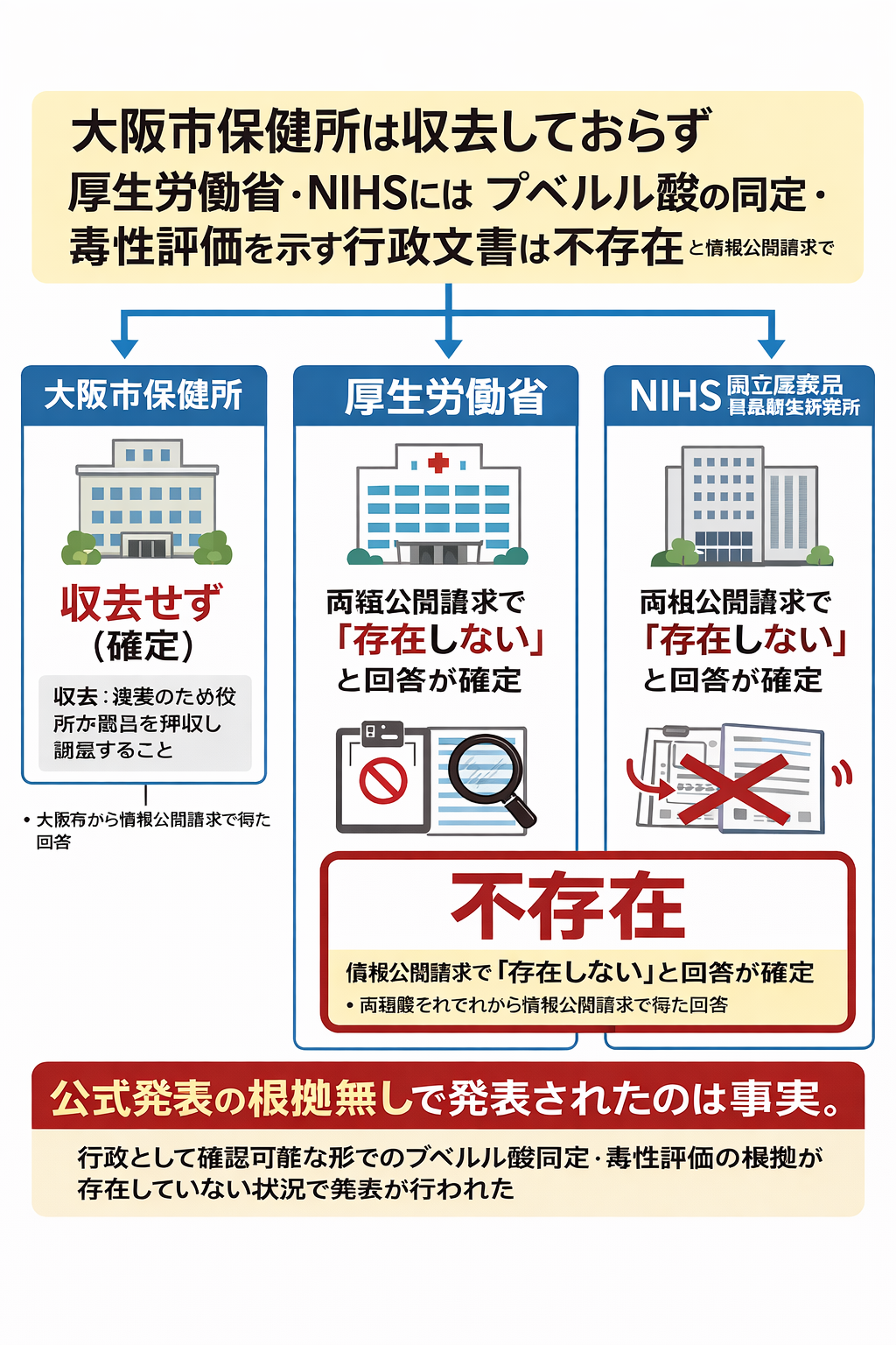 以上の通り、独立した公的検体採取・同定・毒性評価の根拠となる行政文書の存在が確認できない状況にもかかわらず、「プベルル酸が原因物質」とする公式発表が行われた。