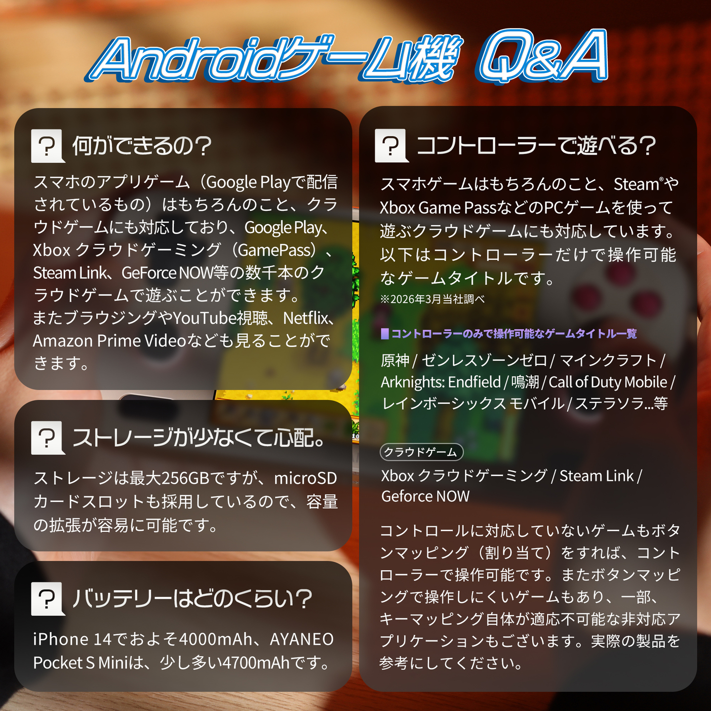 | AYANEO Pocket S Mini 国内正規版 | オプシディアンブラック | Snapdragon G3x Gen 2 / 8GB / 128GB | 77,800円 |