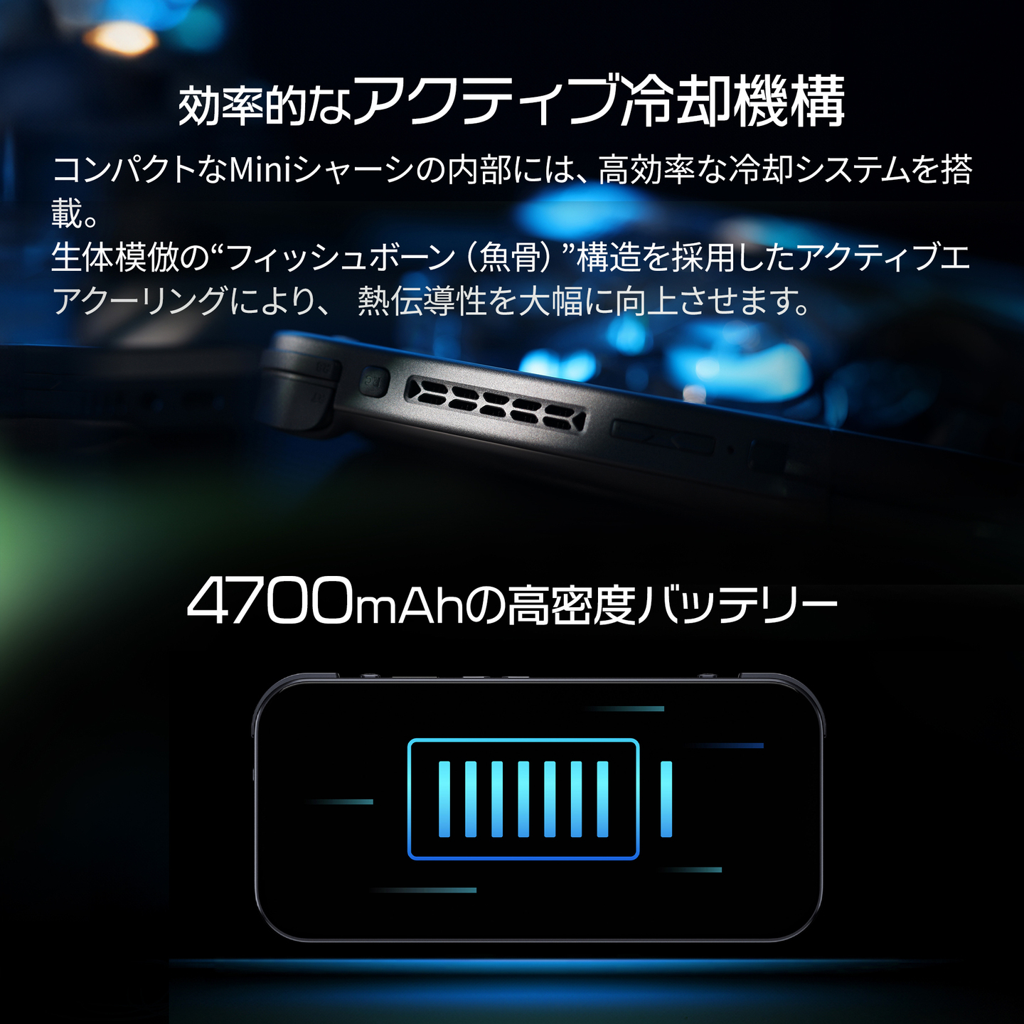 プロセッサーには、モバイルゲーミングに特化した「Snapdragon G3x Gen 2」を搭載。高度なグラフィックス処理を必要とする3Dゲームや、高解像度へのアップスケーリング表示においても、処理遅延を最小限に抑えたスムーズな動作を提供します。強力なアクティブ冷却ファンとの連動により、長時間のプレイでも安定した動作周波数を維持します。