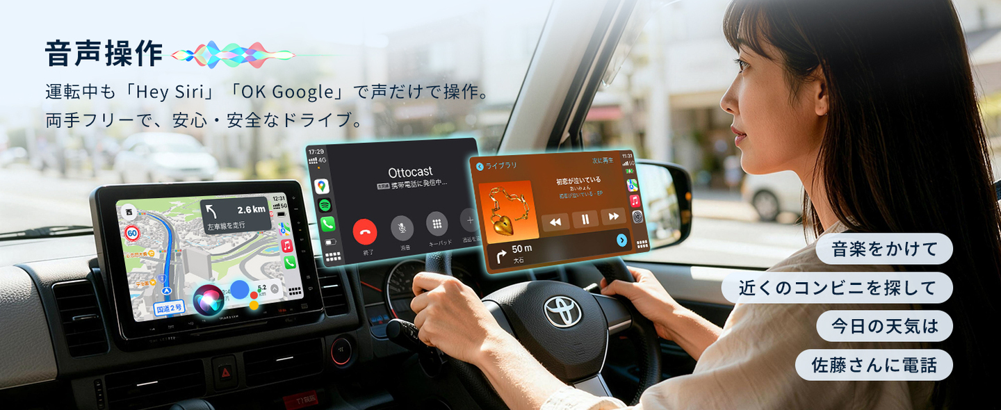 「Hey Siri」や「OK Google」と話しかけるだけで、ハンズフリーで各種操作が可能。
