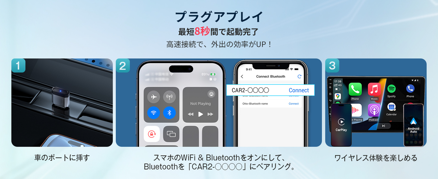 本製品は、有線接続しか対応していないCarPlay/Android Auto対応車両を、USB接続だけでワイヤレス化できる便利なアダプター。特別な取り付け作業は一切不要で、誰でも簡単に使えるのが魅力です。
