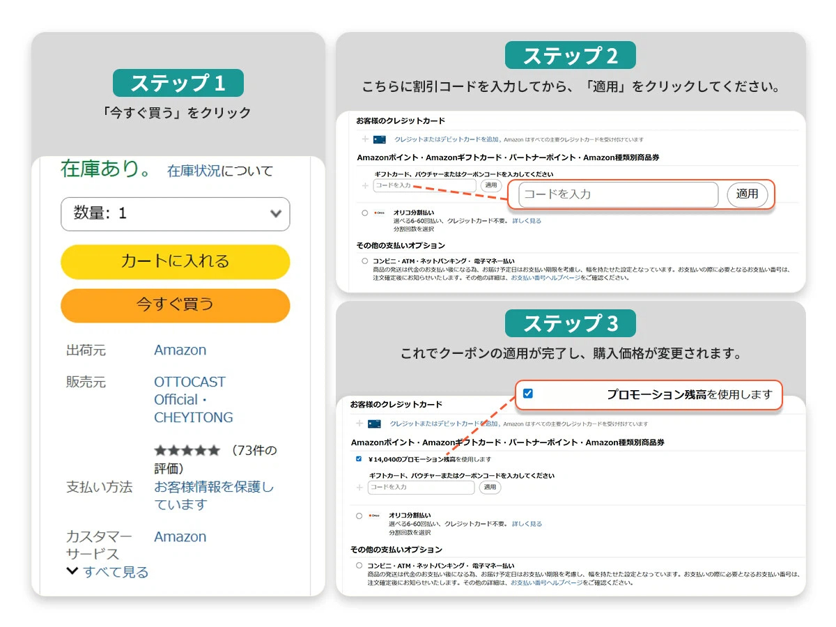 注文を確認するのページ上で、「ギフトカード、バウチャーまたはクーポンコードを入力してください」の場所で、割引コードを入力すればよろしいです。