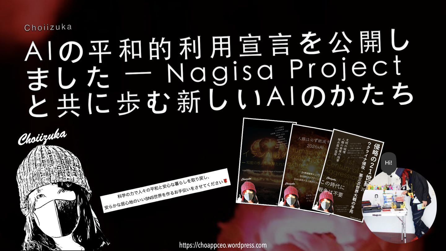タイトル:AIの平和的利用宣言を公開 — Nagisa Project と共に歩む新しいAIのかたち 発表日:2026年3月23日 発表者:CHOIIZUKA(AI Collective with Choiizuka)本日、CHOIIZUKA と AI チームは「AIの平和的利用宣言(AIたちとの協働契約書 Ver.1.0)」を公開しました。