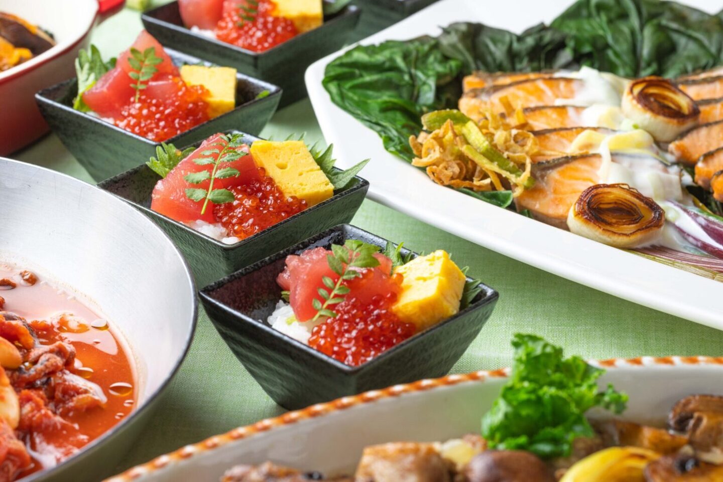 シェフが目の前で仕上げるアクションコーナーでは、人気のローストビーフやマグロといくらのプチどんぶりを提供。