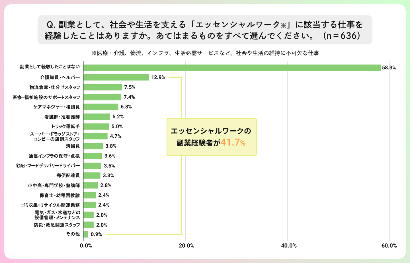 ・エッセンシャルワークの副業経験者は全体の約4割に達し、「介護職員・ヘルパー」など人材不足の職種が上位に。