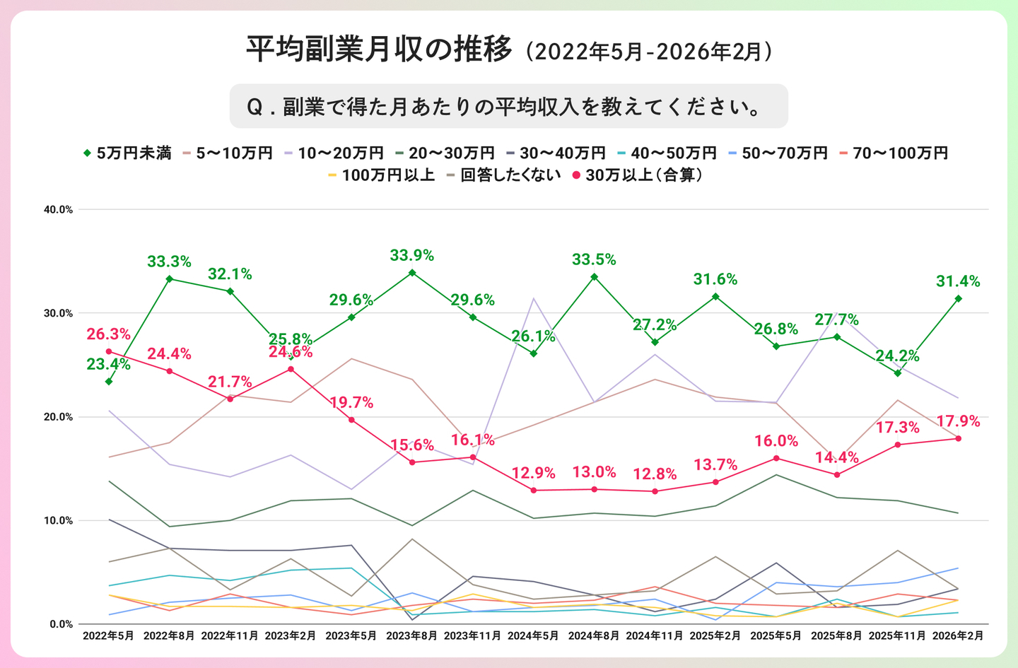 ・副業月収「30万円以上」は17.9%、前回(2025年11月)から0.6ポイント増加。