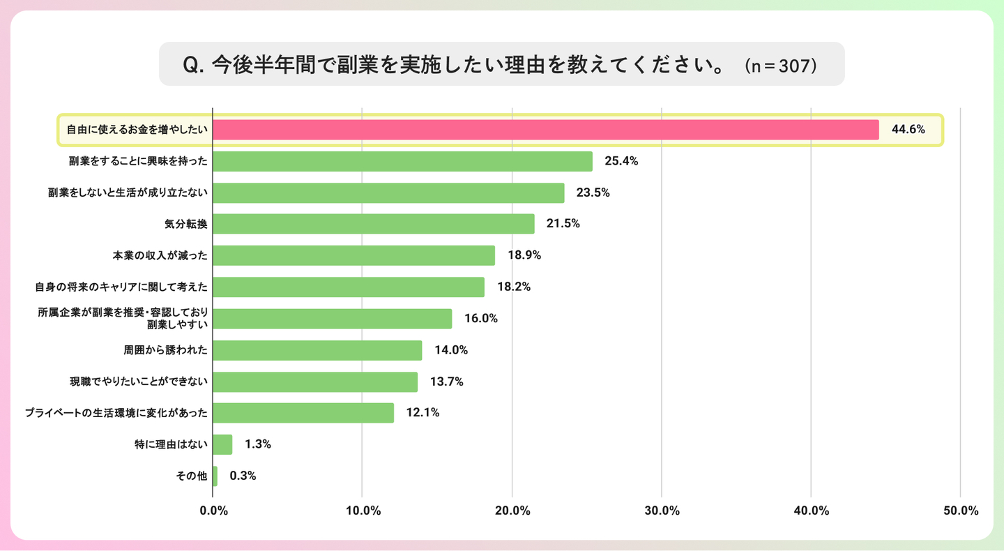 副業を実施する意向がある人にその理由を尋ねたところ、「自由に使えるお金を増やしたい(44.6%)」が引き続き最多となりました。前回調査(2025年11月:39.5%)と比べて5.1ポイント増加しており、経済的な理由が副業意向をより強く後押ししている実態がうかがえます。加えて、「所属企業が副業を推奨・容認しており副業しやすい(16.0%)」が前回調査(15.7%)に続いて過去最多を更新しており、企業側の制度整備や風土醸成が進んでいることも示唆されています。
