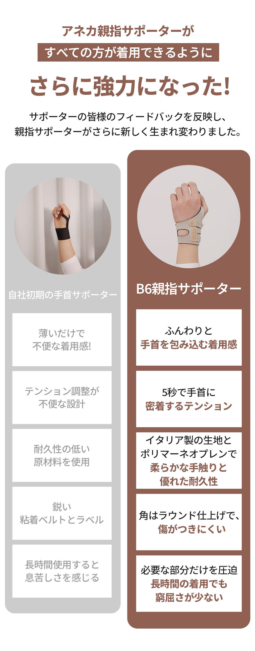 単に親指リングを一つ追加する作業ではなく、誰にでも快適に密着し、活動性に不便のない着用感を提供するサポーターを作るために