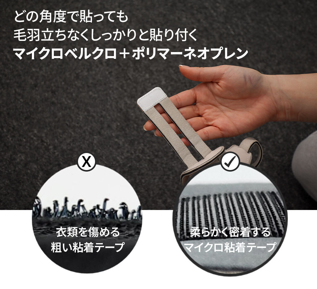 端まで浮き上がりにくく、ピタッと密着する特殊なマイクロ粘着テープを使用。表面の凹凸を極限まで抑えた設計により、袖の長いニットや繊細な生地の衣服と擦れても、生地を傷めにくい仕様です。