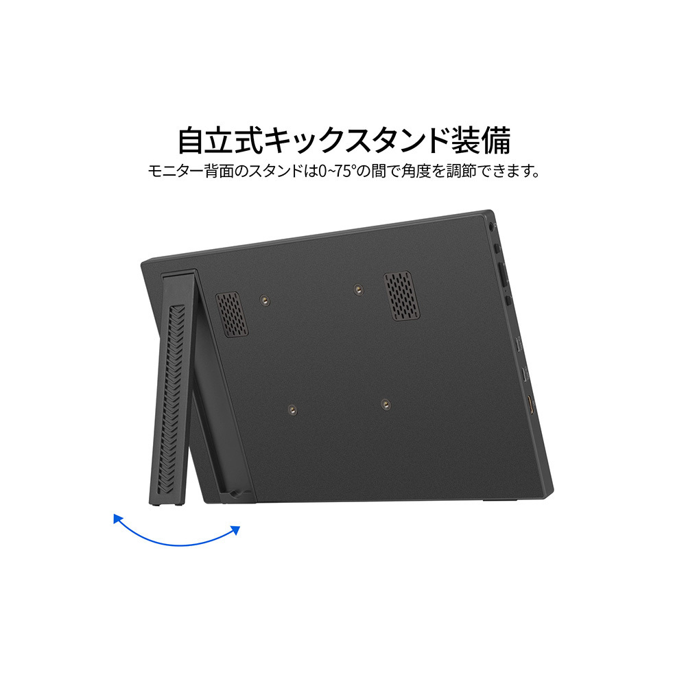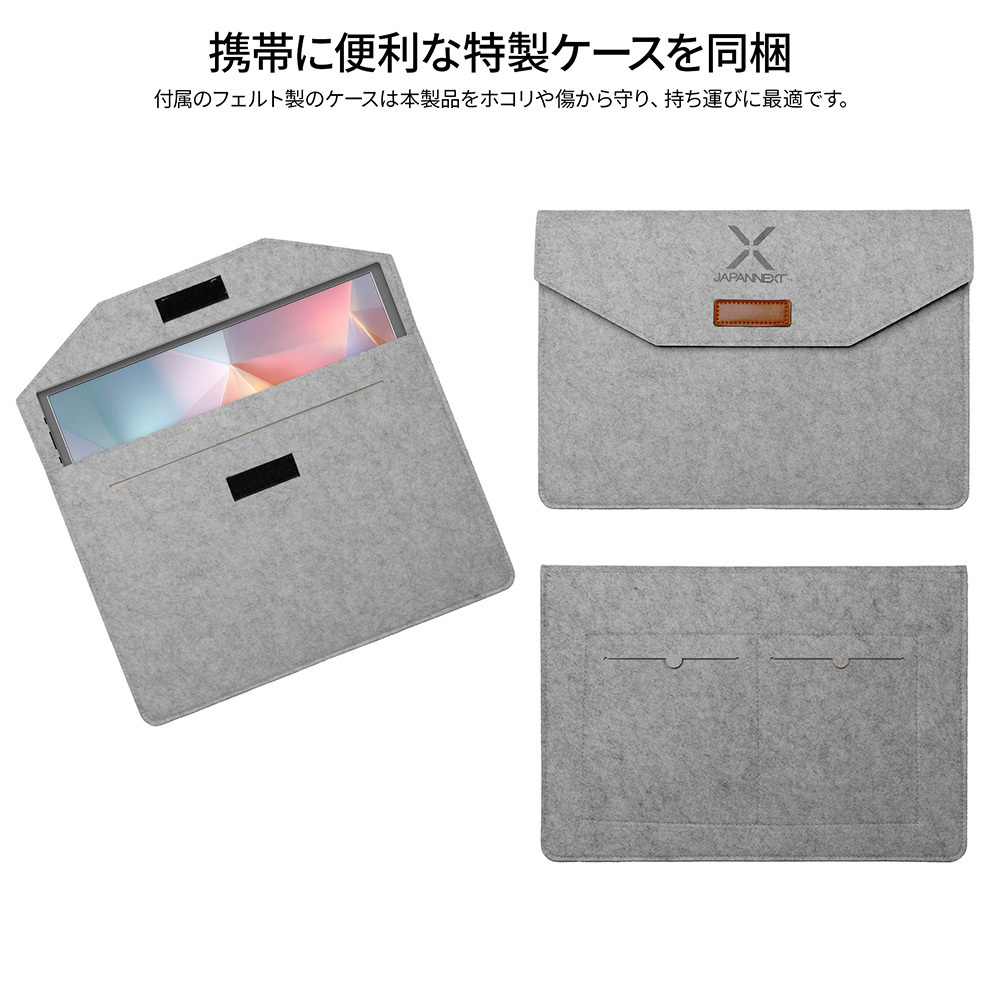 モニター背面にキックスタンドを搭載しているので自立して使用することができ、どこでもデュアルディスプレイ環境の構築が可能です。また、携帯時に便利なフェルトケースを同梱。製品本体をホコリや傷から守り、持ち運びに最適です。