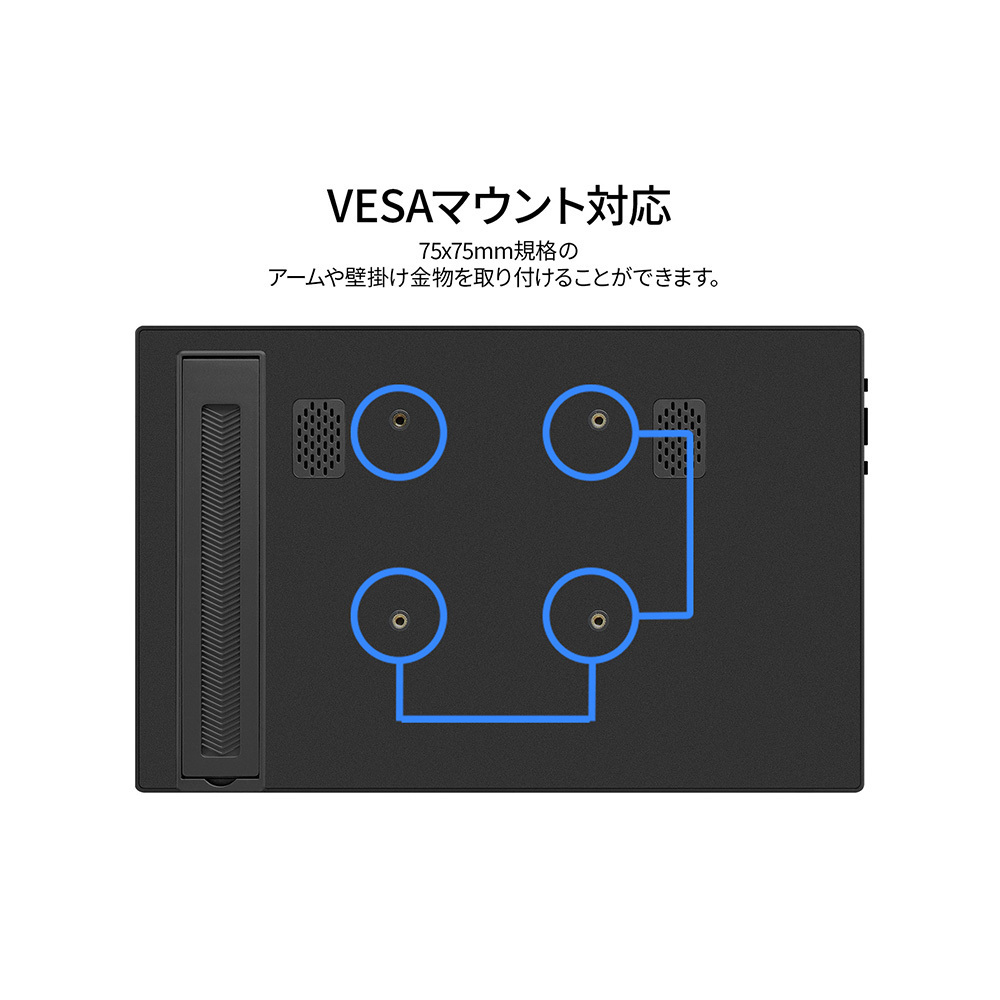 75×75mmのVESAマウントに対応しており、モニターアームなどに取り付けて使用することも可能です。1W×2のスピーカーを内蔵していますので、動画やゲームなどをお楽しみいただけます。