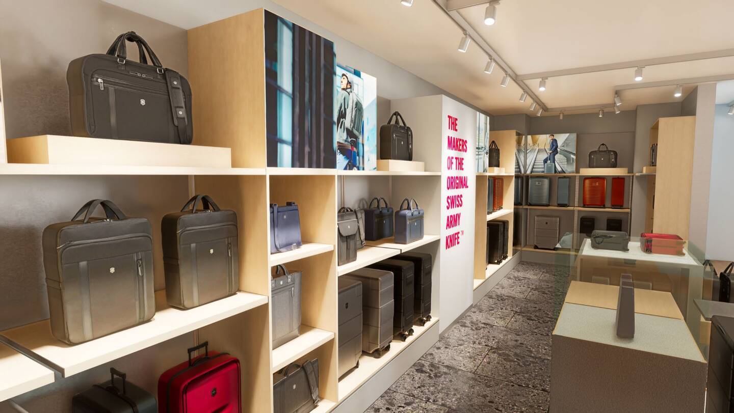 ビクトリノックス 心斎橋店の店内には、ブランドを体現する店舗デザインに加えて、お客様がビクトリノックスを体感できる工夫と、様々な体験スペースをご用意しています。