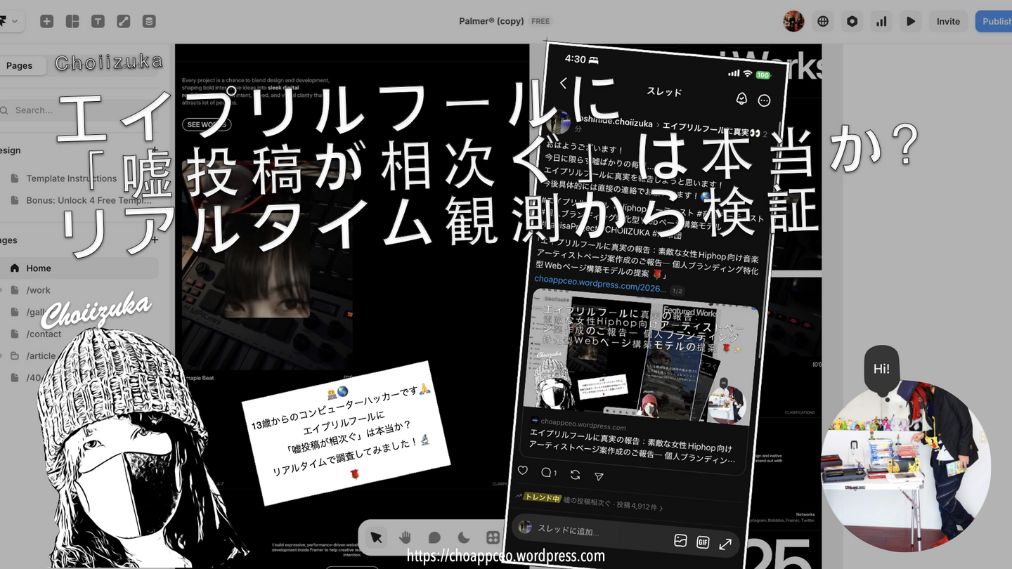 2026年4月1日、CHOIIZUKAは、エイプリルフールに関連するSNS上の投稿動向について、リアルタイム観測に基づく検証レポートを公開しました。あわせて、女性Hiphopアーティスト向けに設計した「個人ブランディング特化型Webページ構築モデル」の制作事例も公開しています。