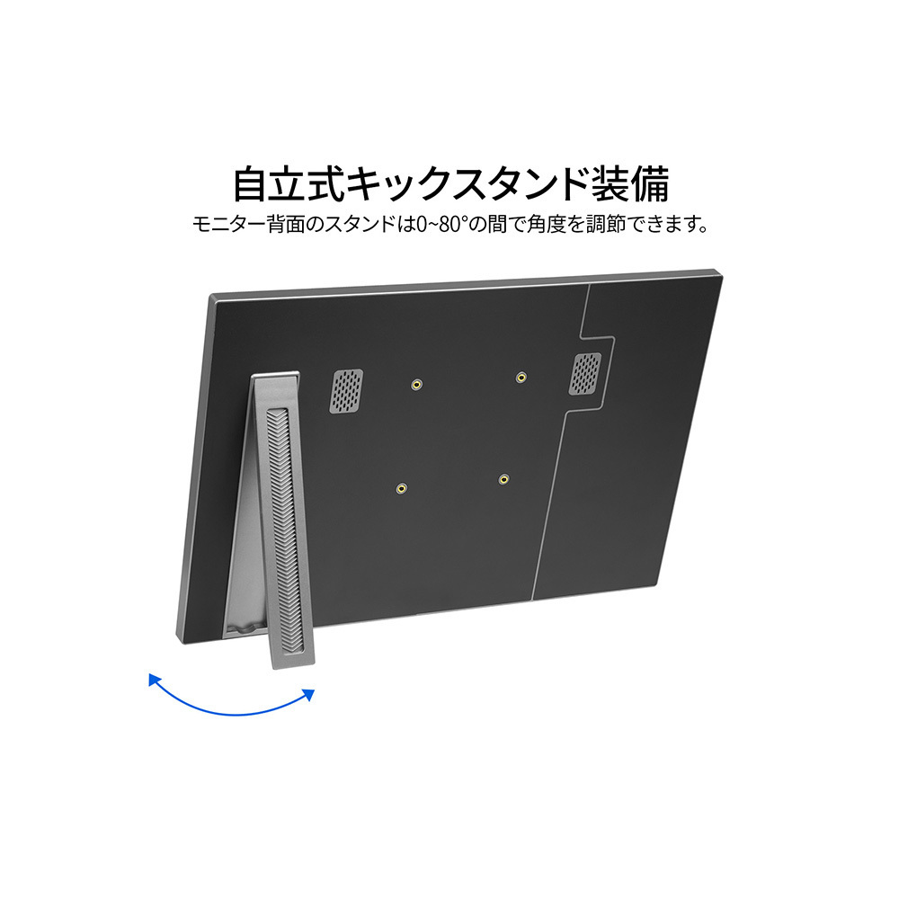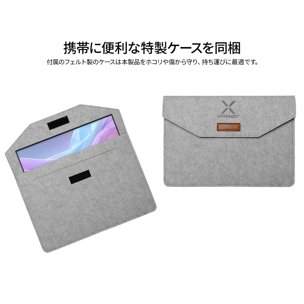 モニター背面にキックスタンドを搭載しているので自立して使用することができ、どこでもデュアルディスプレイ環境の構築が可能です。また、携帯時に便利なフェルトケースを同梱。製品本体をホコリや傷から守り、持ち運びに最適です。