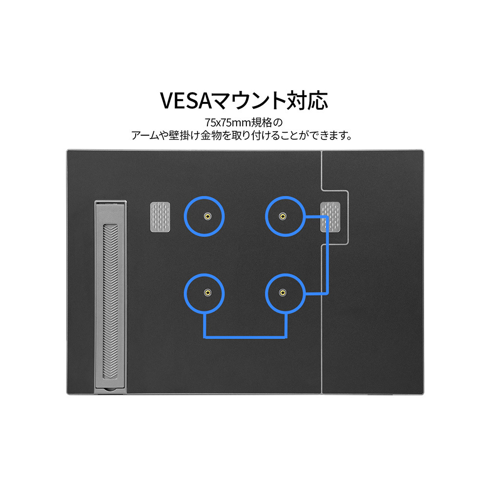 75×75mmのVESAマウントに対応しており、モニターアームなどに取り付けて使用することも可能です。1W×2のスピーカーを内蔵していますので、動画やゲームなどをお楽しみいただけます。