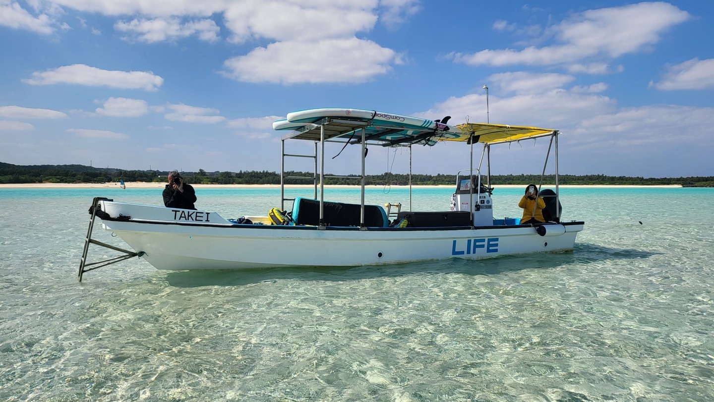 ご案内するボートは、様々なマリンアクティビティをコンディションに併せてヨロン周辺の行く先々の海でいつでも遊べるようにと船長がこだわって鉄工所に特注して作ったこだわりのオリジナル艤装をほどこし、トーイングタワー、ルーフキャリア、ルーフデッキの3つを1つにしたスペシャル仕様です。トーイングボートとしては大型の28ftの船体が生み出すウェイキはスピンやインバートも出来るようなウェイクボード上級者でも楽しく遊べます。ルーフデッキから撮影した百合ヶ浜での写真はまるでドローンを飛ばしたようなアングルからの記念すべき一枚です。