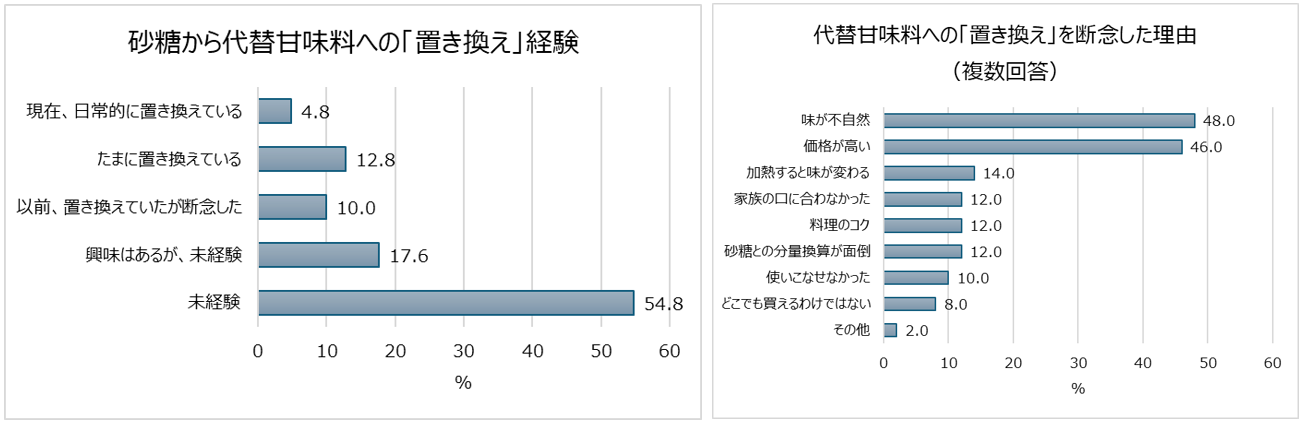 一方で、過去に挑戦したものの「断念した(10.0%)」層にその理由を聞くと、「味が不自然(48.0%)」や「価格が高い(46.0%)」が突出して多く、次いで「加熱すると味が変わる(14.0%)」や「砂糖との分量換算が面倒(12.0%)」が挙がりました。健康への意欲は高いものの、味の質や使い勝手が継続のポイントとなっている実態が伺えます。