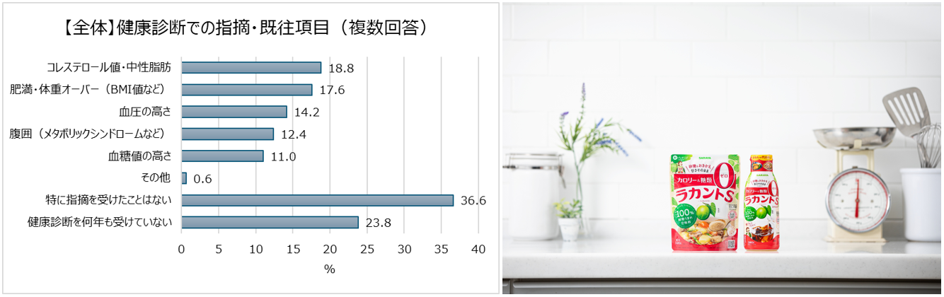50代の6割、40代の4割以上が「健診で指摘・予備軍判定」!指摘項目1位「コレステロール・中性脂肪」2位「肥満」。砂糖から他の甘味料への置き換え経験者約3割