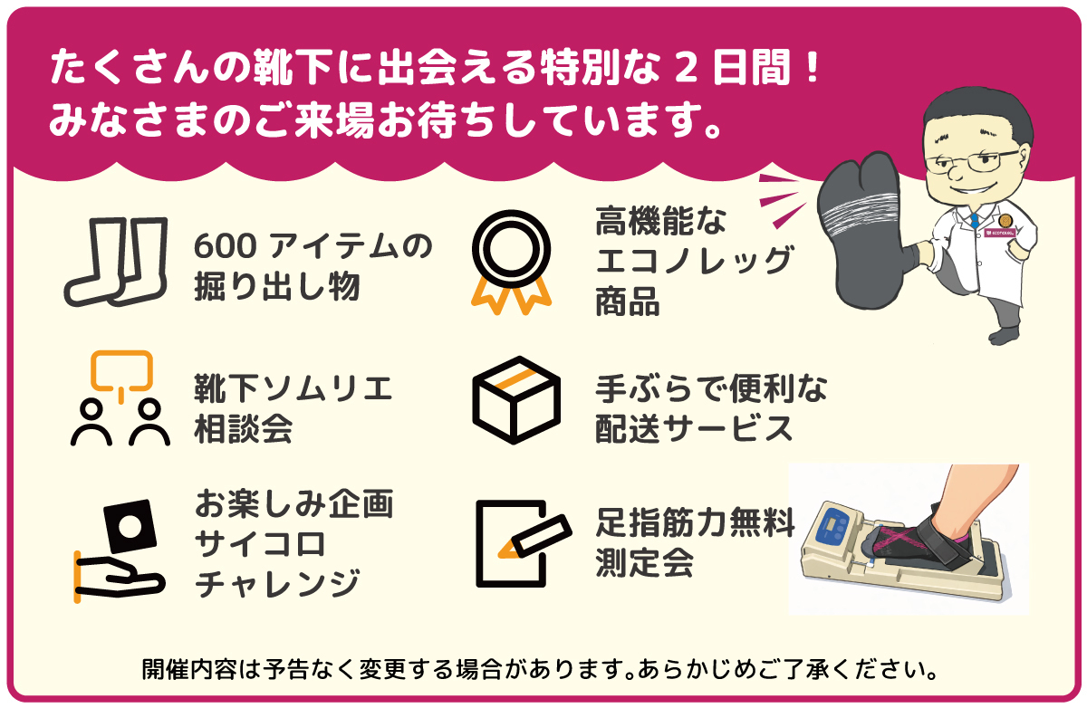 【エコノレッグ・西垣靴下 春のイベント】開催 2026年春「くつ下感謝祭」工場直売 4月11日(土)12日(日)の2日間 両日ともに9:00~16:00 婦人・紳士・子ども・スポーツ・エコノレッグの高機能くつ下など約600アイテムのお得な商品を即売。 ■特別企画その1 3,300円のお買い上げで【LINEクーポン割引またはSNS登録で】11日12日両日とも300円引き、お一人様1回限りとなります。 ■特別企画その2 お買い物金額3300円毎に【サイコロチャレンジ】 3割の確率で素敵な商品が当たる!■特別企画その3 【足指筋力無料測定会】開催。足指が体を救う!かも。ご来場は公共交通機関をご利用ください。住所:奈良県大和高田市大谷61 JR五位堂駅徒歩3分、近鉄大阪線五位堂駅徒歩15分。