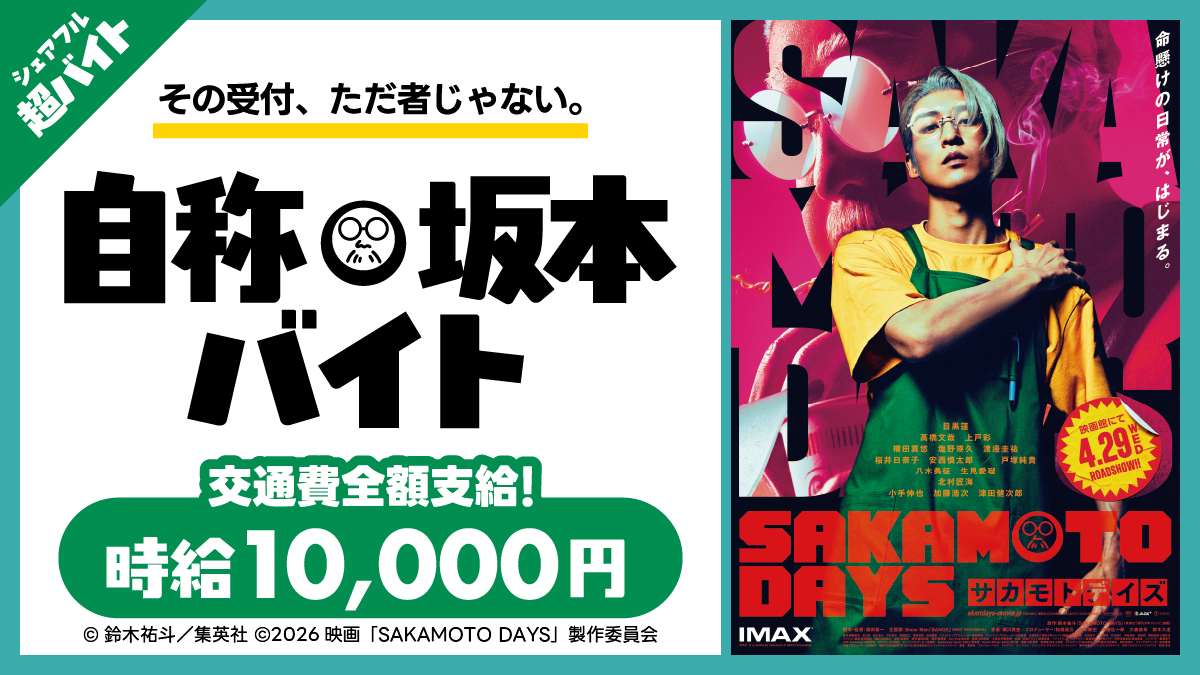 「はたらいて、笑おう。」をビジョンに掲げるパーソルグループのスキマバイトアプリ『シェアフル』やSaaSシフト管理サービス『シェアフルシフト』、就業実績を活用した人材紹介サービス『シェアフルエージェント』などを提供するシェアフル株式会社(本社:東京都港区、代表取締役社長:横井 聡)は、2026年4月29日(水・祝)に都内で行われる映画『SAKAMOTO DAYS』の舞台挨拶にて、坂本の格好をして受付をする「自称・坂本バイト」を『シェアフル』超バイトで募集します。