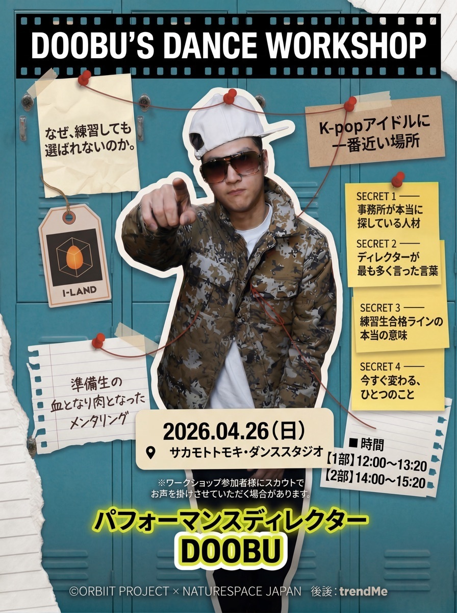 ORBIIT PROJECT(運営:株式会社trendMe)は、ENHYPENを輩出したMnet「I-LAND」のパフォーマンスディレクターDOOBUによる日本初のダンスワークショップ「DOOBU'S DANCE WORKSHOP」を2026年4月26日(日)にサカモトトモキ・ダンススタジオ(東京都新宿区矢来町65 2F)にて全2部制で開催します。K-POPアイドルを目指す方に向けて、業界が求める人材像や合格ラインの真意など「4つのシークレット」を実践的に伝授します。一般5,000円、会員4,000円。チケット販売中。