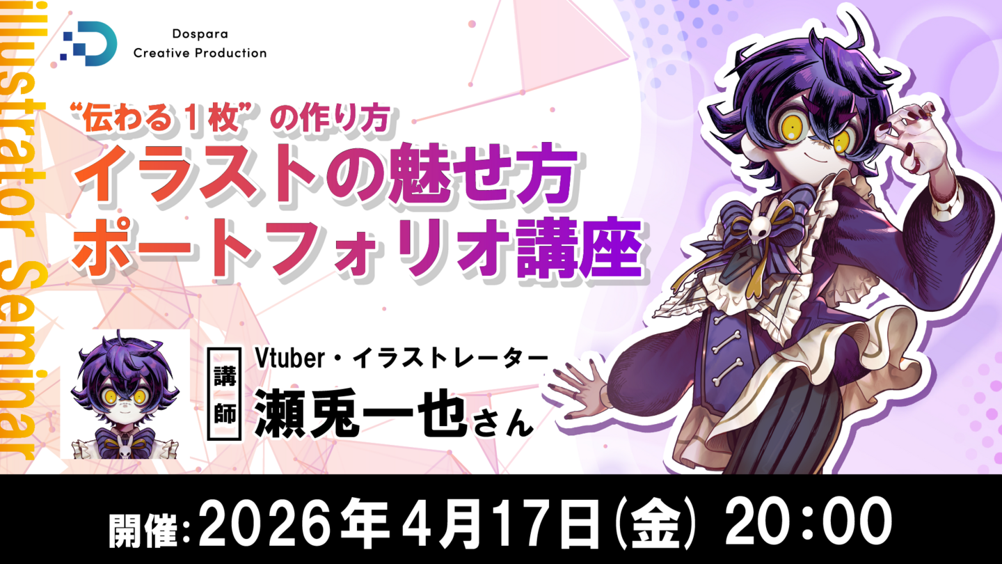ドスパラは、瀬兎一也氏を講師に迎え、『“伝わる1枚”の作り方 イラストの魅せ方・ポートフォリオ講座』を2026年4月17日(金)20時よりオンラインで開催します。現在、参加者を募集しています。