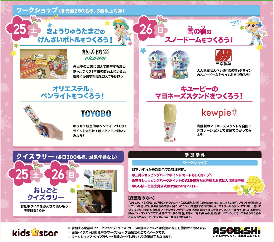株式会社キッズスター(東京都渋谷区、代表取締役:平田全広)は、2026年4月25日(土)・26日(日)の2日間、ららぽーと富士見(埼玉県富士見市)にて、親子向け社会体験イベント「ごっこランドEXPO」を開催いたします。各出店企業と共同開発した「完全オリジナル」ワークショップを通じて、親子で社会や仕事について楽しく学べるイベントです。
