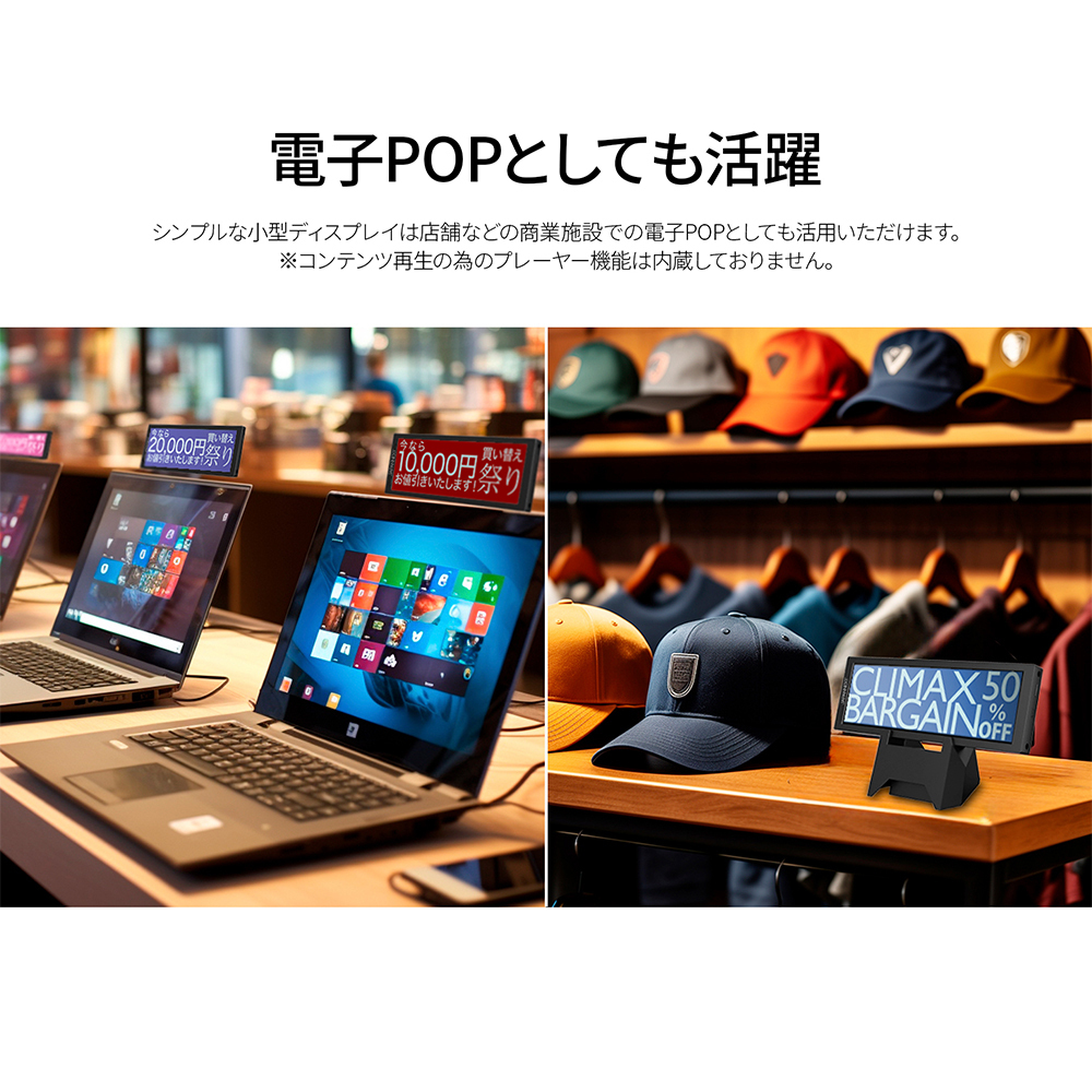 シンプルな小型ディスプレイは店舗などの商業施設での電子POPとしても活用いただけます。※1. コンテンツ再生の為のプレーヤー機能は内蔵しておりません。※2. スピーカーは内蔵しておりません。