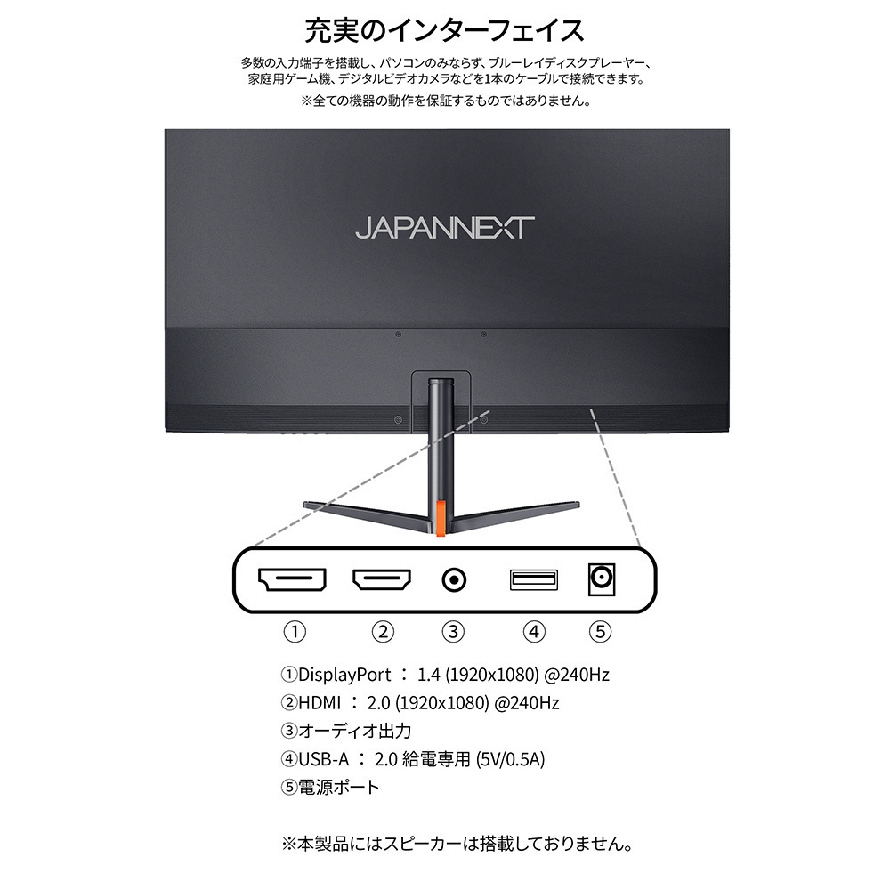 | 入出力端子 | HDMI 2.0×1 (240Hz) DisplayPort 1.4×1 (240Hz) オーディオ出力×1 |