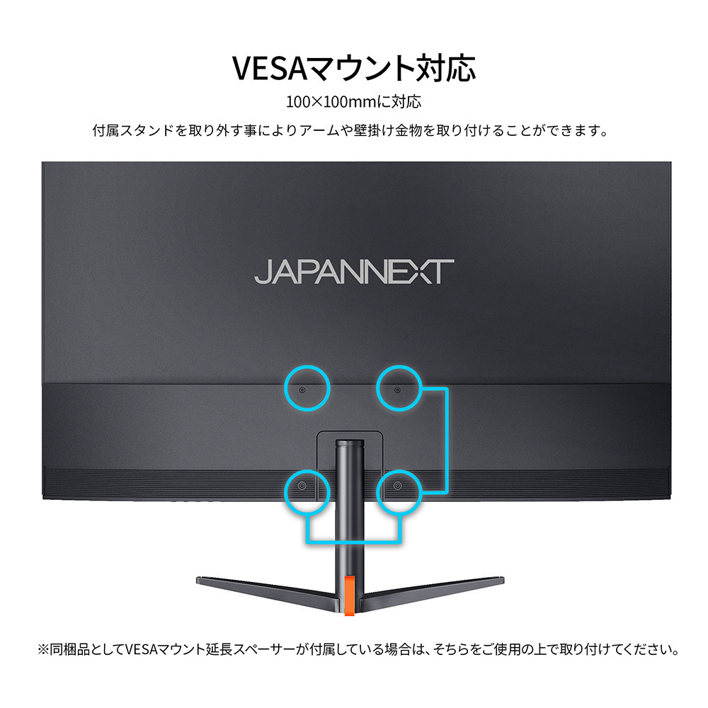 100×100mmのVESAマウントに対応しているので別売のモニターアームやモニタースタンドなどへの取り付けが可能です。スピーカーは搭載しておりません。本製品には、2年間のメーカー保証が付きます。