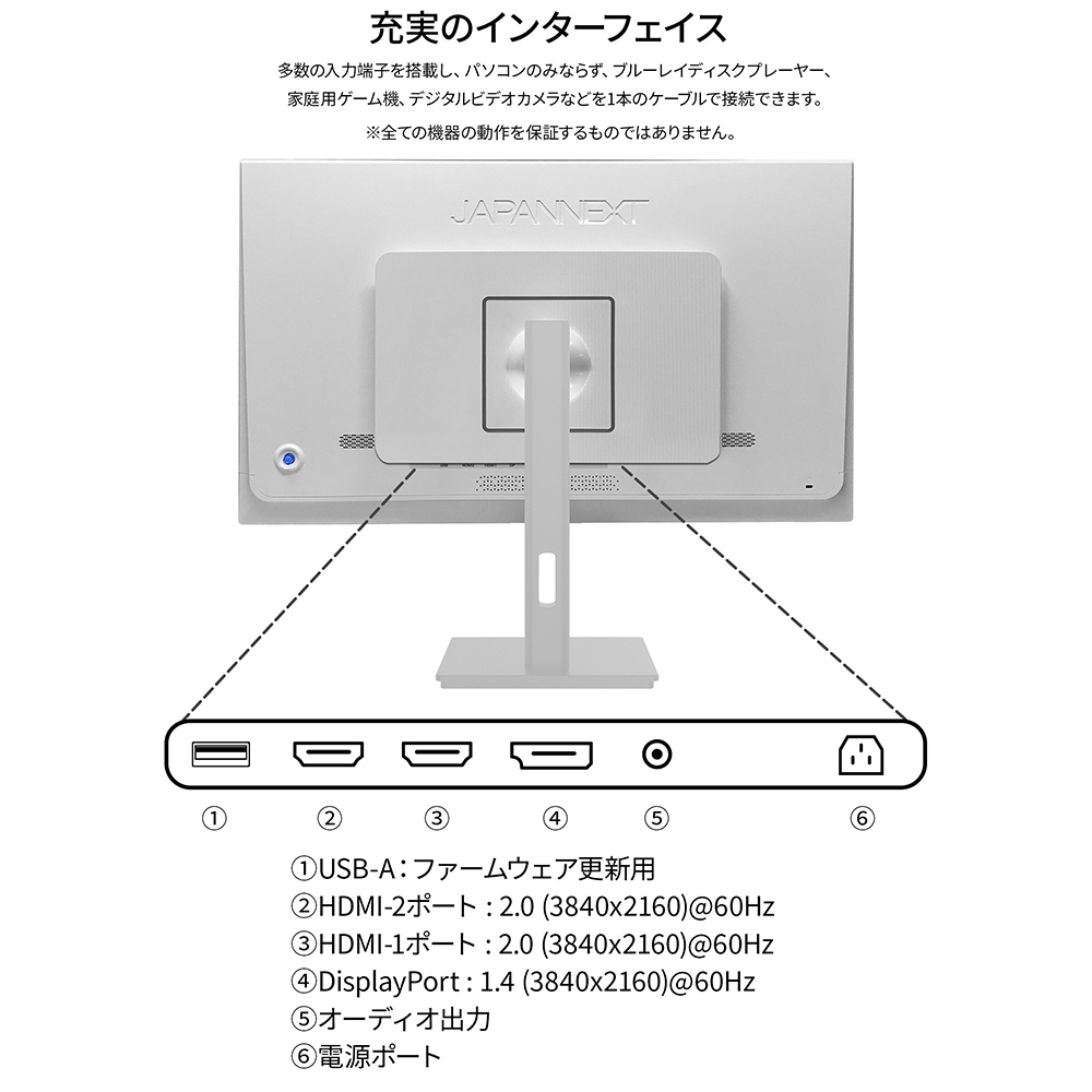 インターフェイスは、HDMI 2.0×2 (60Hz)とDisplayPort 1.4×1 (60Hz)を装備し、様々な機器との接続が可能です。