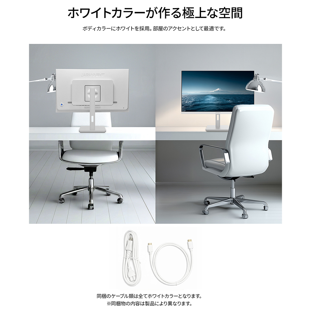 本体カラーにホワイトを採用。モニターベゼルやスタンドも白となっており、爽やかでおしゃれな空間を演出したい場合や、デバイスを白で統一したい場合に最適です。また、付属のケーブル類にもホワイトカラーを採用。全体が白基調に統一された部屋や医療機関などでの使用にも最適です。