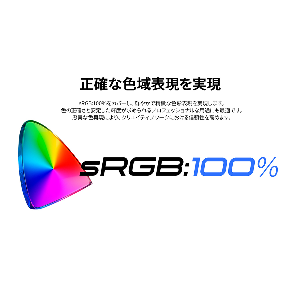 あらゆる角度から見ても色やコントラストの変化がおきにくいIPSパネルを搭載し、広視野角上下左右178°を実現します。最大輝度350cd/m2の液晶パネルは、sRGB:100%の広色域に対応し、写真や動画編集などの作業にも最適です。