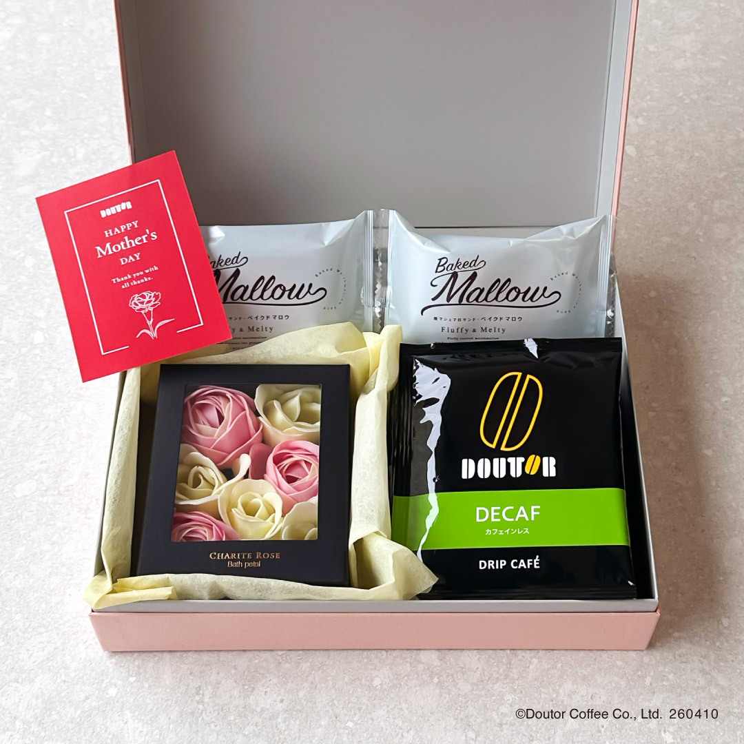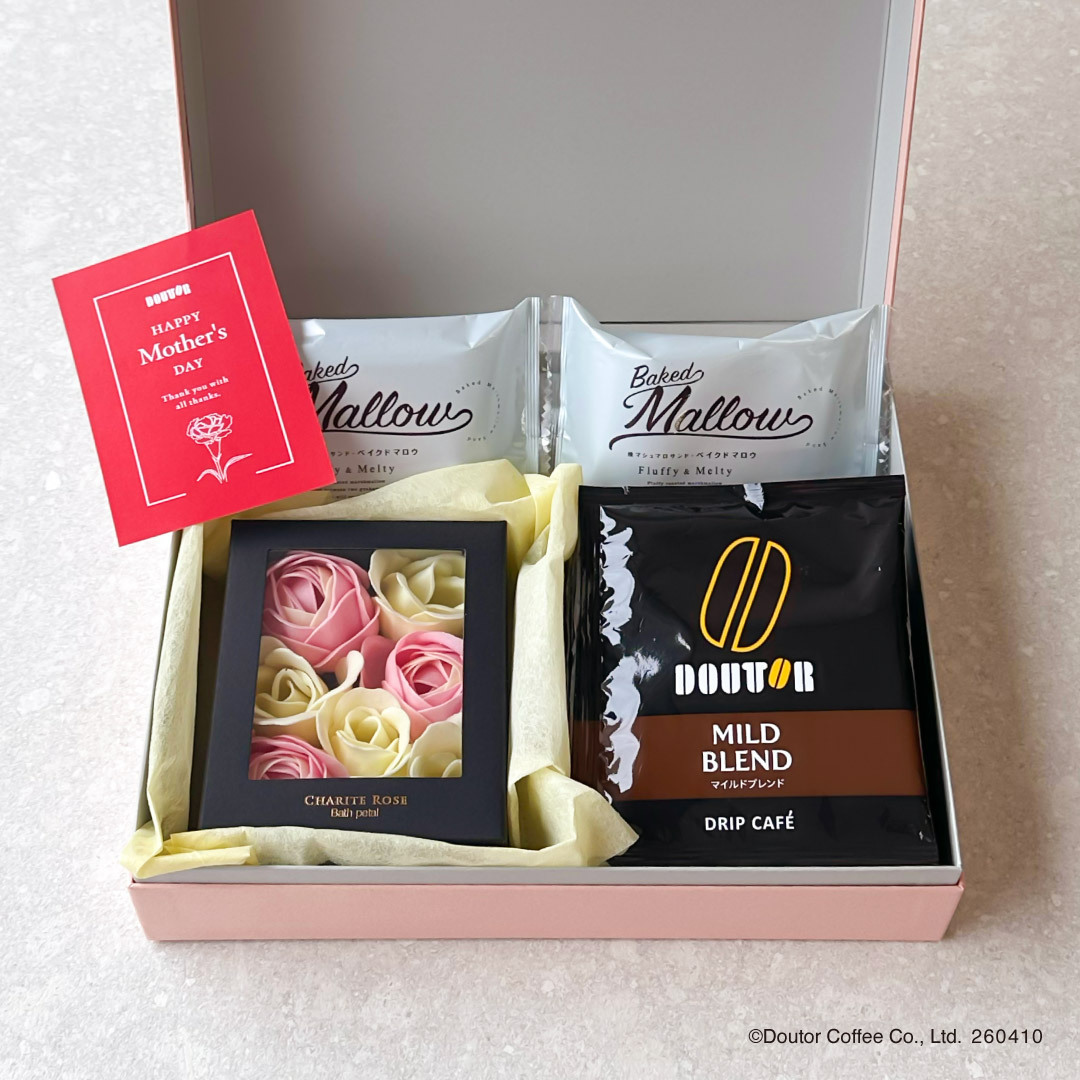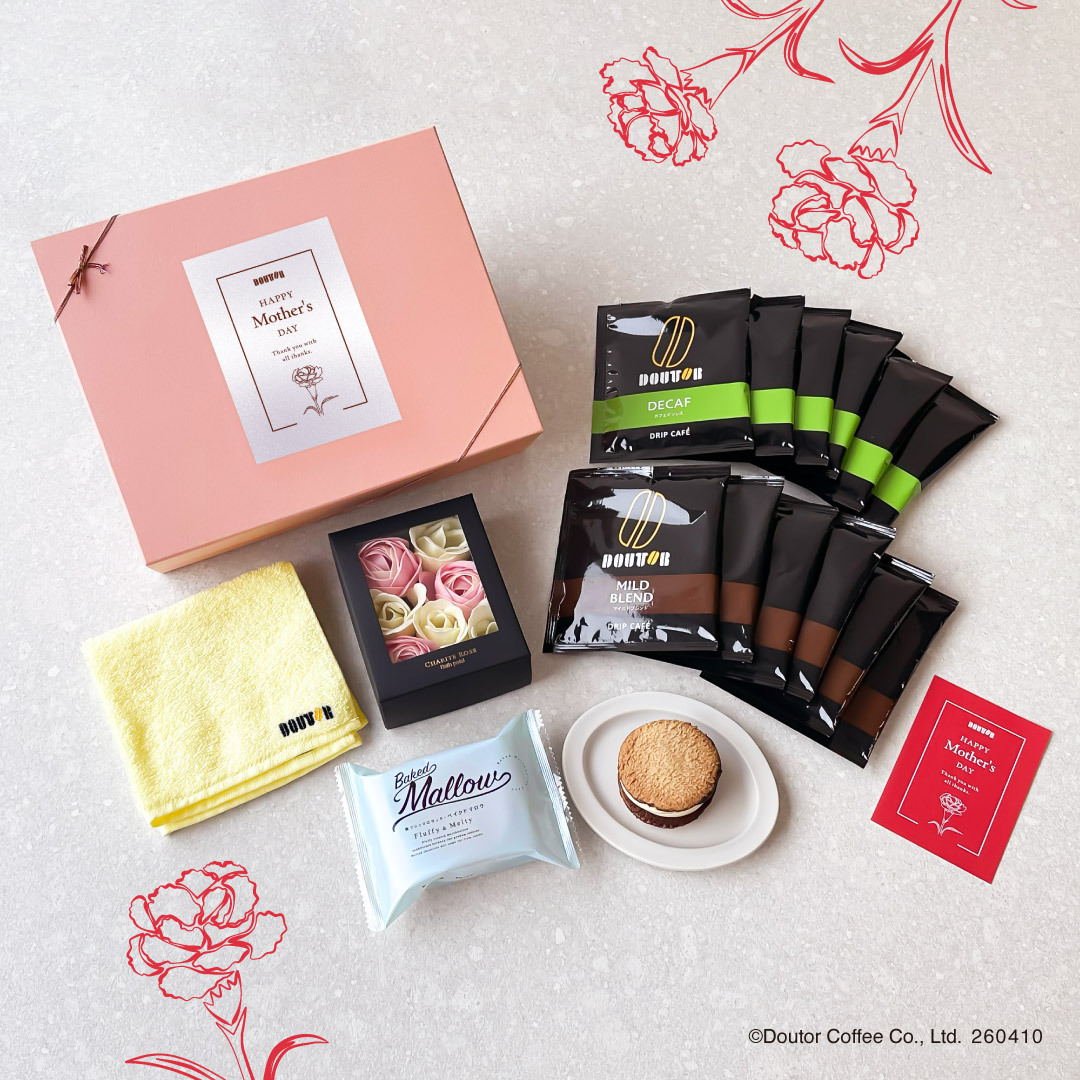 株式会社ドトールコーヒー(本社:東京都渋谷区/代表取締役社長:星野 正則)は、2026年4月10日より、公式通販サイト「ドトール オンラインショップ」にて、ほっとひとときを贈る「選べる母の日ギフト」の予約を開始いたします。ドリップカフェと人気のスイーツ、オリジナルハンドタオルやソープフラワーを詰め合わせた、母の日限定の特別なギフトです。贈る方の好みに合わせて組み合わせを選べる、心まであたたまる母の日ギフト。「ありがとう」と「ほっとする時間」を一緒に贈りませんか。
