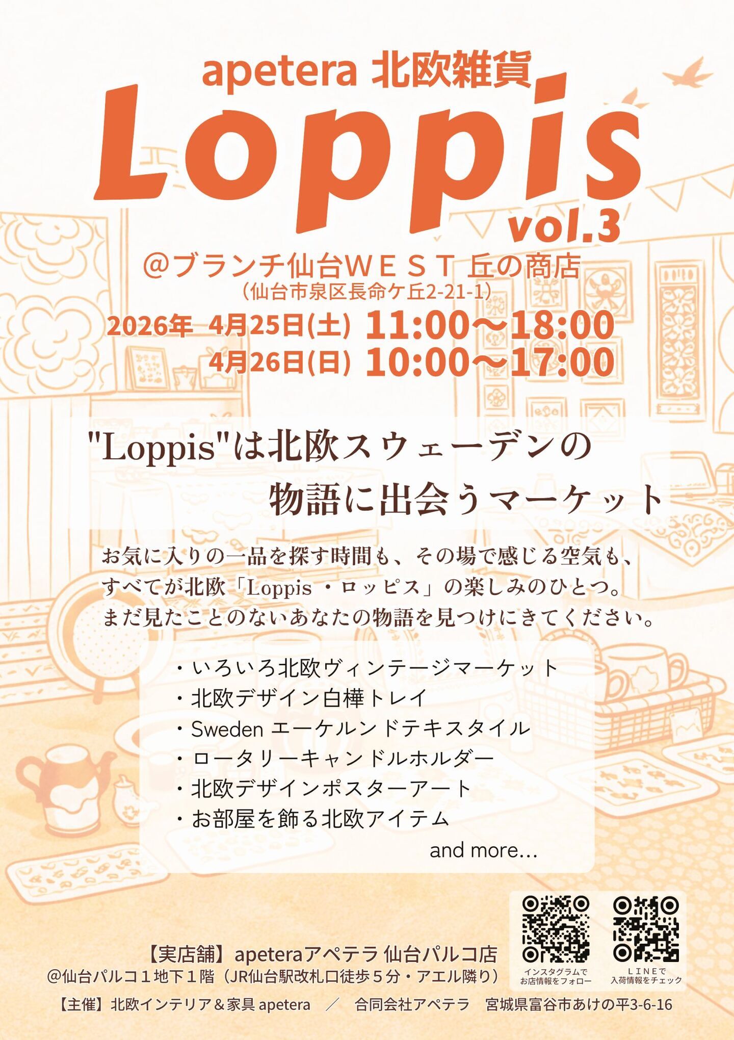 北欧家具&インテリアのセレクトショップ apeteraアペテラは、北欧雑貨イベント「Loppis vol.3」をブランチ仙台で開催 ― 物語に出会うマーケット、春の仙台で開催 ― 北欧家具&インテリアapetera(仙台パルコ1地下1階)/合同会社アペテラ(宮城県富谷市)は、北欧雑貨の販売イベント 「Loppis・ロッピス vol.3」 を、2026年4月25日(土)・26日(日)の2日間、ブランチ仙台WESTにて開催いたします。