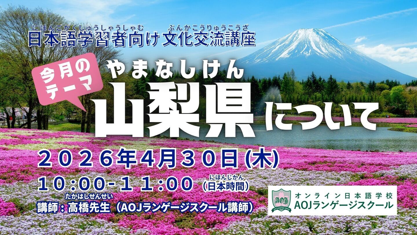 オンライン日本語学校「AOJランゲージスクール」運営、日本語能力試験学習サイト「Attain Online Japanese」運営、日本語能力試験対策eラーニング制作のアテイン株式会社(本社:東京都江東区、電話:03-6381-8641)は、日本語学習者向けの日本文化交流講座を4月30日(木)10:00〜11:00に開催します。日本語講師と日本の地域文化を一緒に学びながら日本語での会話練習を行うことができるイベントです。今回のテーマは「山梨県について」です。お申し込みはメール、またはお問い合わせフォームより受け付けています。日本語を練習し、日本が好きな新しい友達を作るこの無料の機会に、ぜひお申し込みください。お申し込みはこちら:info@aoj-ls.jp