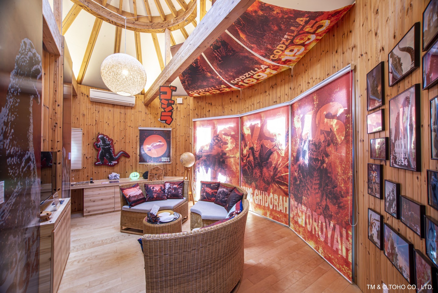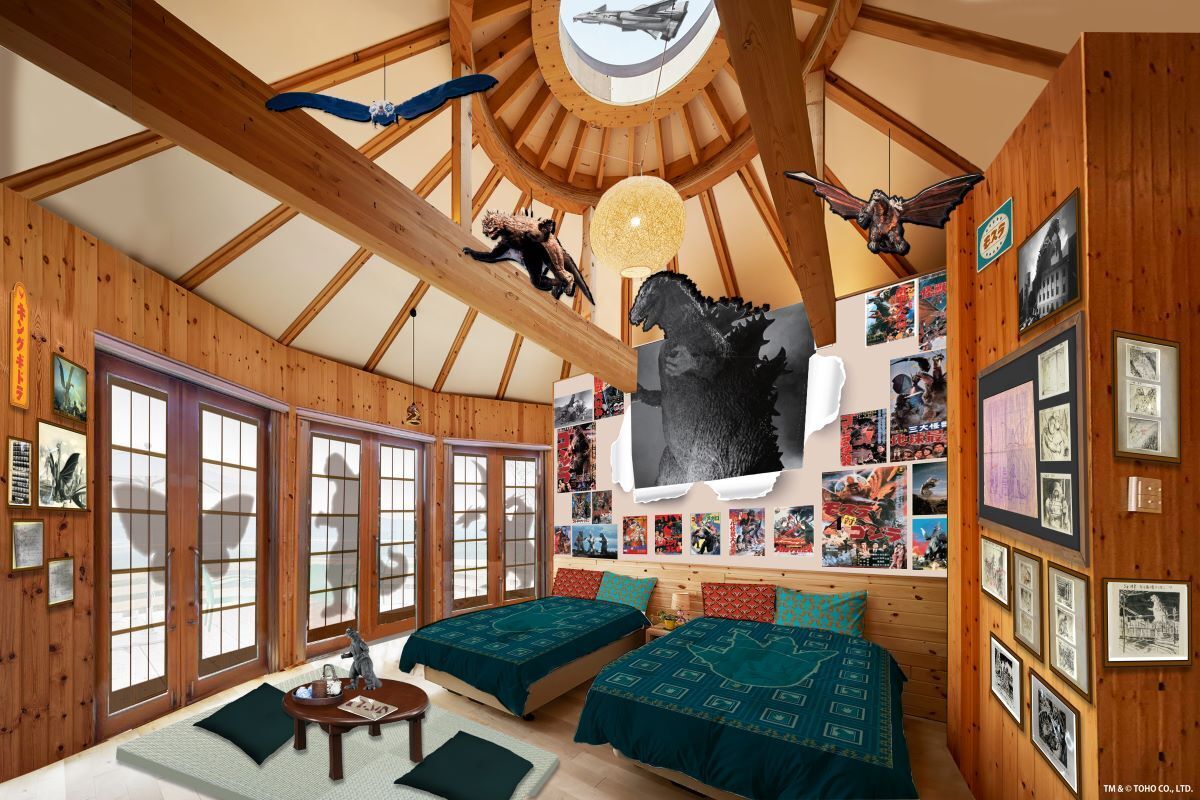 「GRAND CHARIOT 北斗七星135°」の一棟を、日本を代表する特撮映画「ゴジラ」をテーマに装飾。“昭和レトロ”をモチーフに、同作品の世界観と昭和時代が再現された空間を存分に楽しむことができる