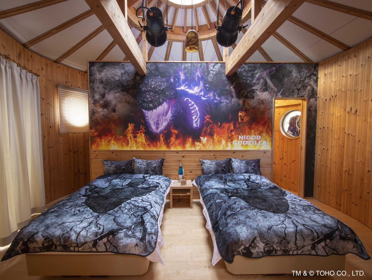 室内には、歴代ゴジラと人気怪獣たちが描かれたインテリアやタペストリー、窓越しに見える実寸大ゴジラの一部、さらに、それらに光の照射で見え方が変わる特殊加工を施すことによって、昼・夜で異なった室内の雰囲気をお楽しみいただけます。室内に隠れた全ての怪獣たちを見つけ出すことで豪華特典が手に入る“特別任務”に挑戦していただくなど、昼夜通してお愉しみいただけるお部屋です。