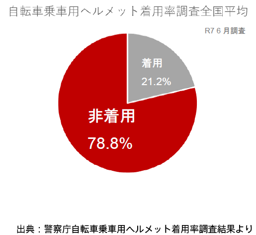 一方、ヘルメット着用率は2025年6月の調査によると、全国平均で21.2%にとどまっています。