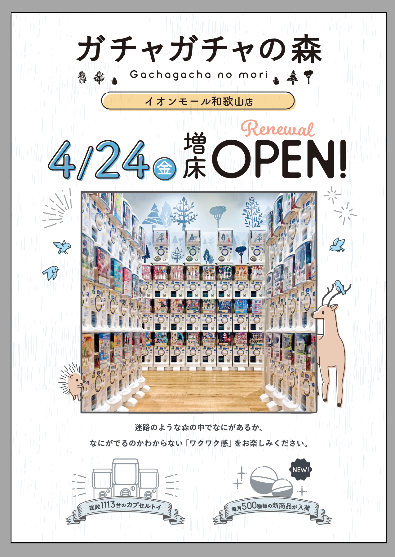 株式会社ルルアークは、2026年4月24日(金)、イオンモール和歌山にて「ガチャガチャの森」の増床リニューアルと、カプセルトイショップ「Pon!」の同時オープンを実施いたします。「ガチャガチャの森」は設置台数を約660台から1,113台へと拡大し、「Pon!」651台と合わせ、総台数1,700台超の和歌山エリア最大級カプセルトイ売場が誕生します。