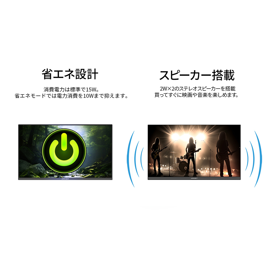 75×75mmのVESAマウントに対応しますので、別売りのモニターアームなどに使用が可能です。2W×2のスピーカーを内蔵しています。
