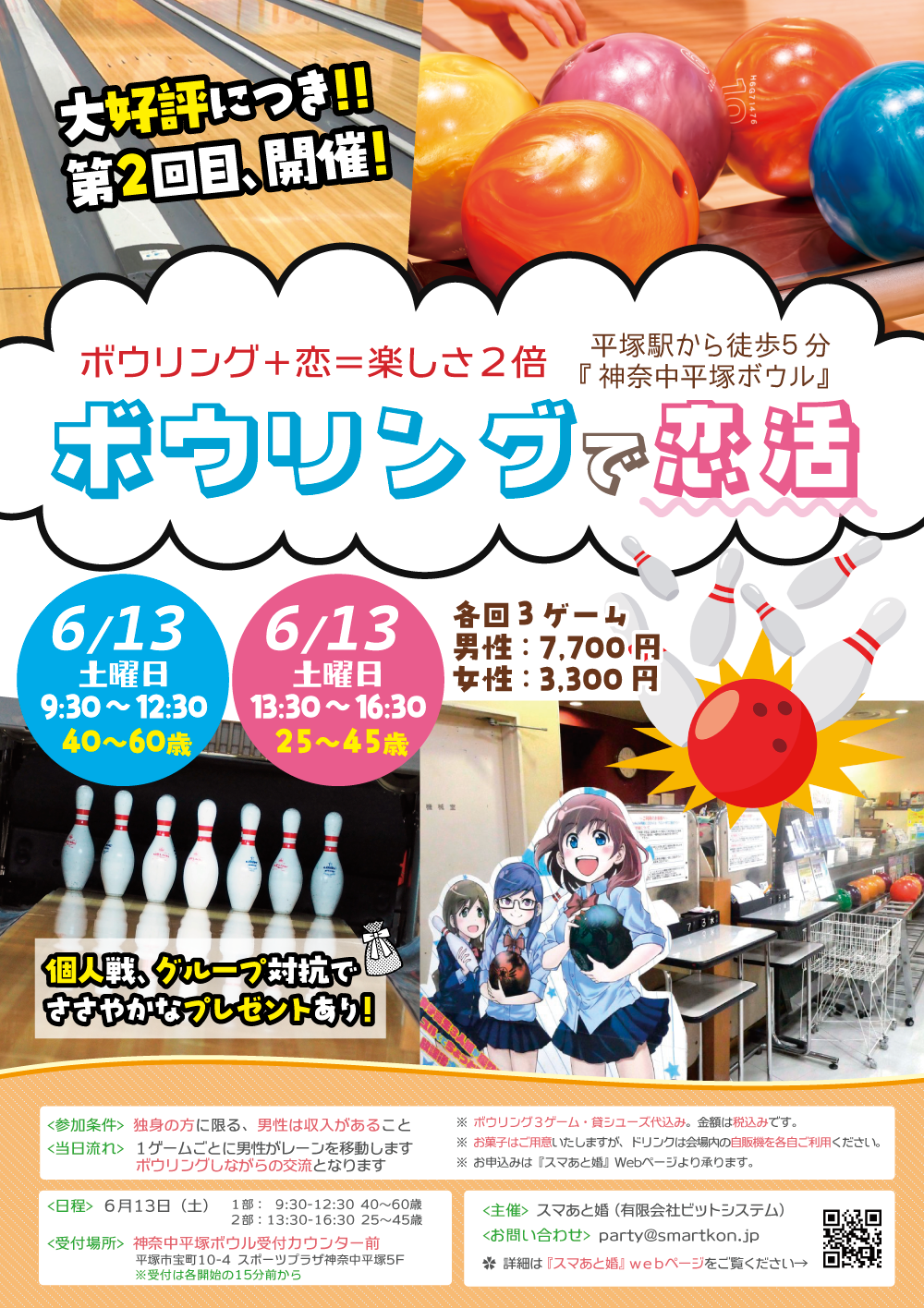 「みんな大好きボウリングで交流しよう!」開催のお知らせ婚活イベントを企画・運営する「スマあと婚」は、誰でも気軽に楽しめる体験型恋活イベント「みんな大好きボウリングで交流しよう!」を2026年6月13日(土)に2部構成(25-45歳、40-60歳)で開催いたします。本イベントは、平塚駅から徒歩5分の神奈中平塚ボウルにて開催されるボウリング恋活イベントで、ご好評により第2回目の開催となります。
