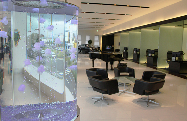 2000年の発表以来、NHK「おはよう日本」や全国紙の1面で紹介。人工筋肉技術を応用した特殊樹脂により、生きたクラゲのような“ゆらぎ”を再現し、安心感や居心地の良さを演出します。設置後は水質管理不要、メンテナンス完全サポートで手間なく運用できます。