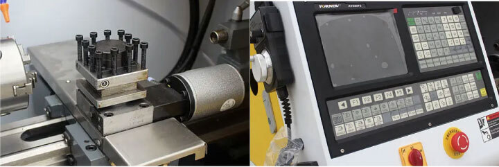 CNCプログラムによって制御される刃物台(4ポジションまたは8ステーション選択可)を装備。外径・内径旋削、ネジ切り、突切りといった複数工程を、人の手を介さずワンチャックで完結。加工の段取り替えを大幅に効率化します。