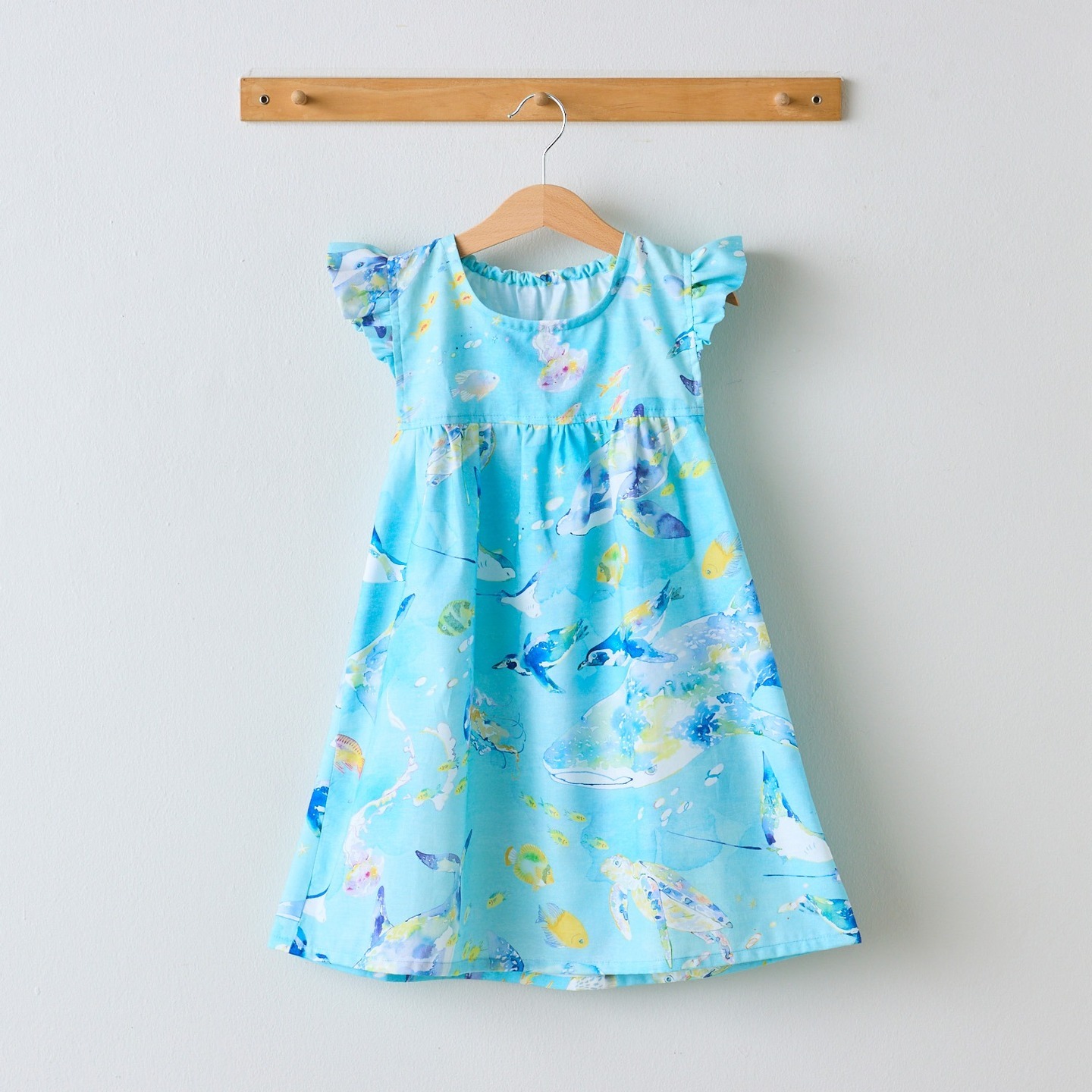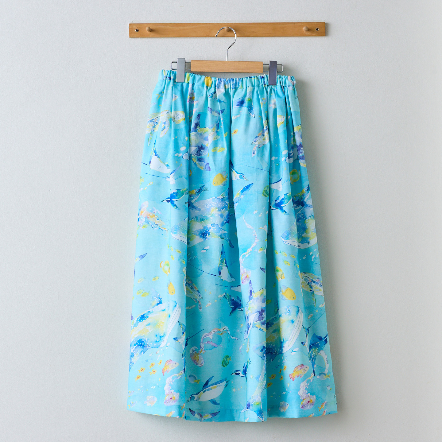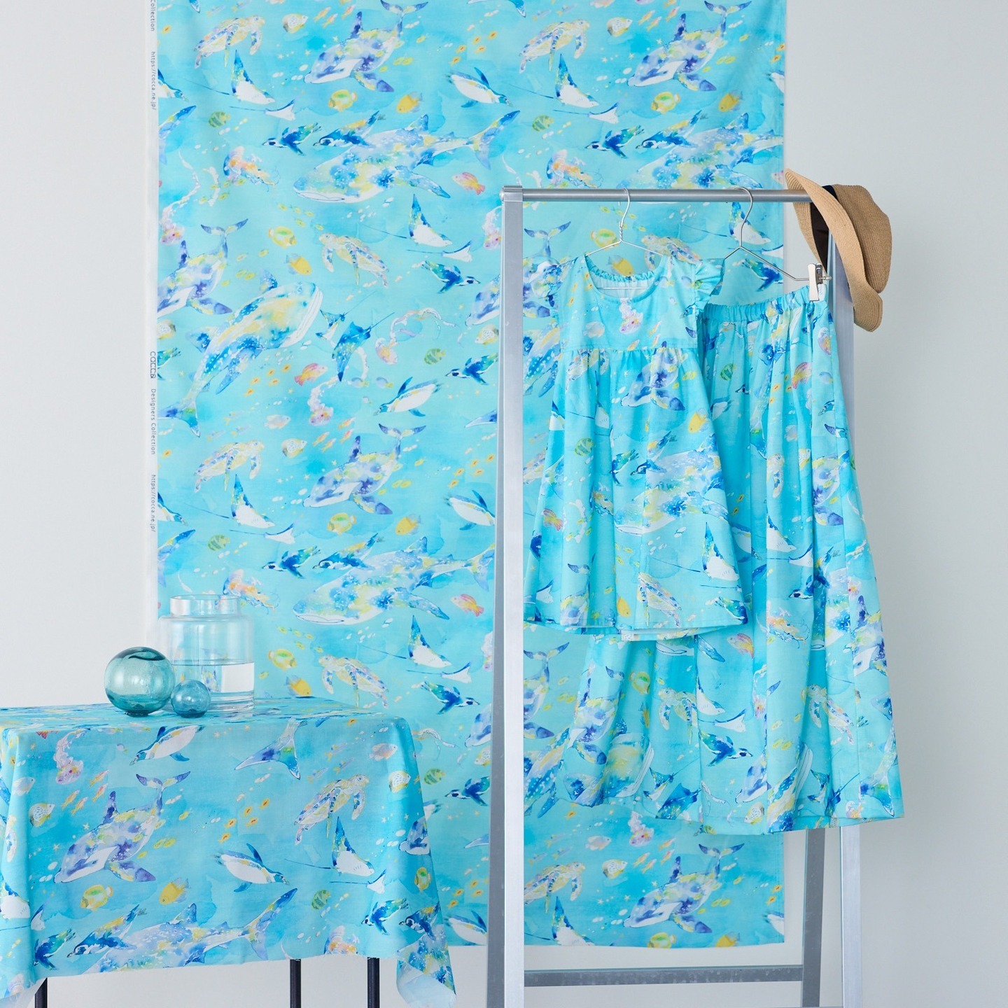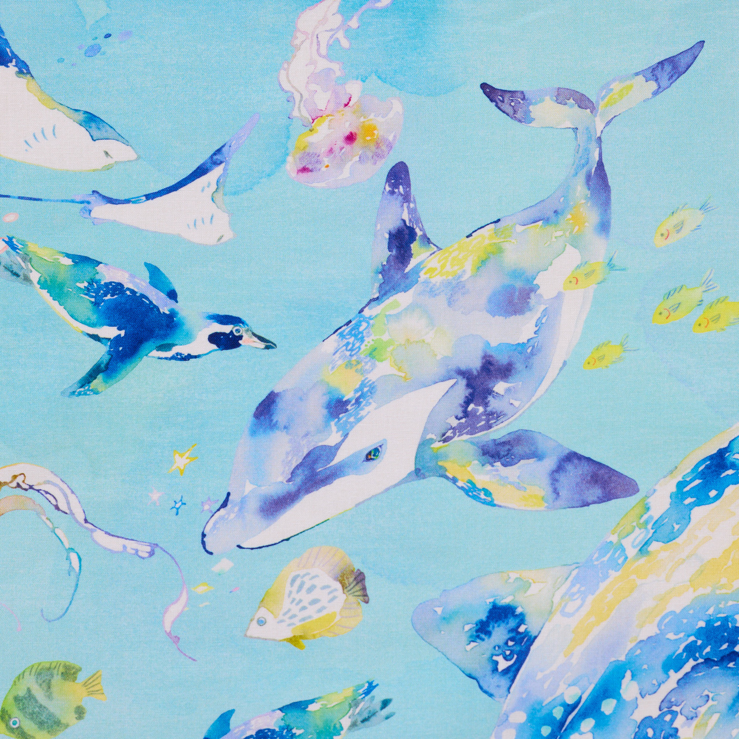 自由に泳ぐクジラやイルカ、ペンギン、エイなど、水中の豊かな情景を描いたデザインは、裁断する箇所によって異なる表情を楽しめるのが魅力です。