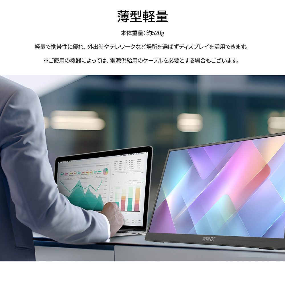 本体重量:約520g、最薄部9mmの薄型軽量本体は、優れた携帯性を備えています。ワーケーション中や外出先、ご自宅のリビングなど、大きなディスプレイを設置できないさまざまな環境でも、手軽にマルチディスプレイ環境を構築可能です。高精細な画面により、写真や資料の表示はもちろん、プレゼンテーション時にお客様へ画面をお見せしたり、外出先でゲームや動画コンテンツを楽しむなど、幅広い用途に対応します。