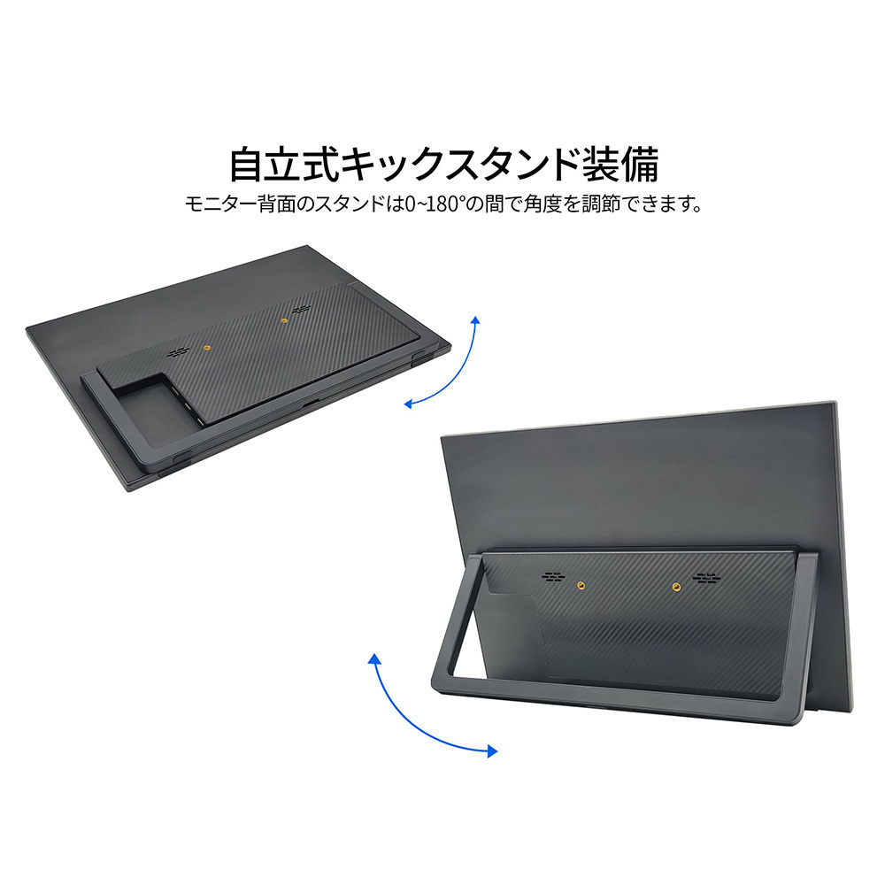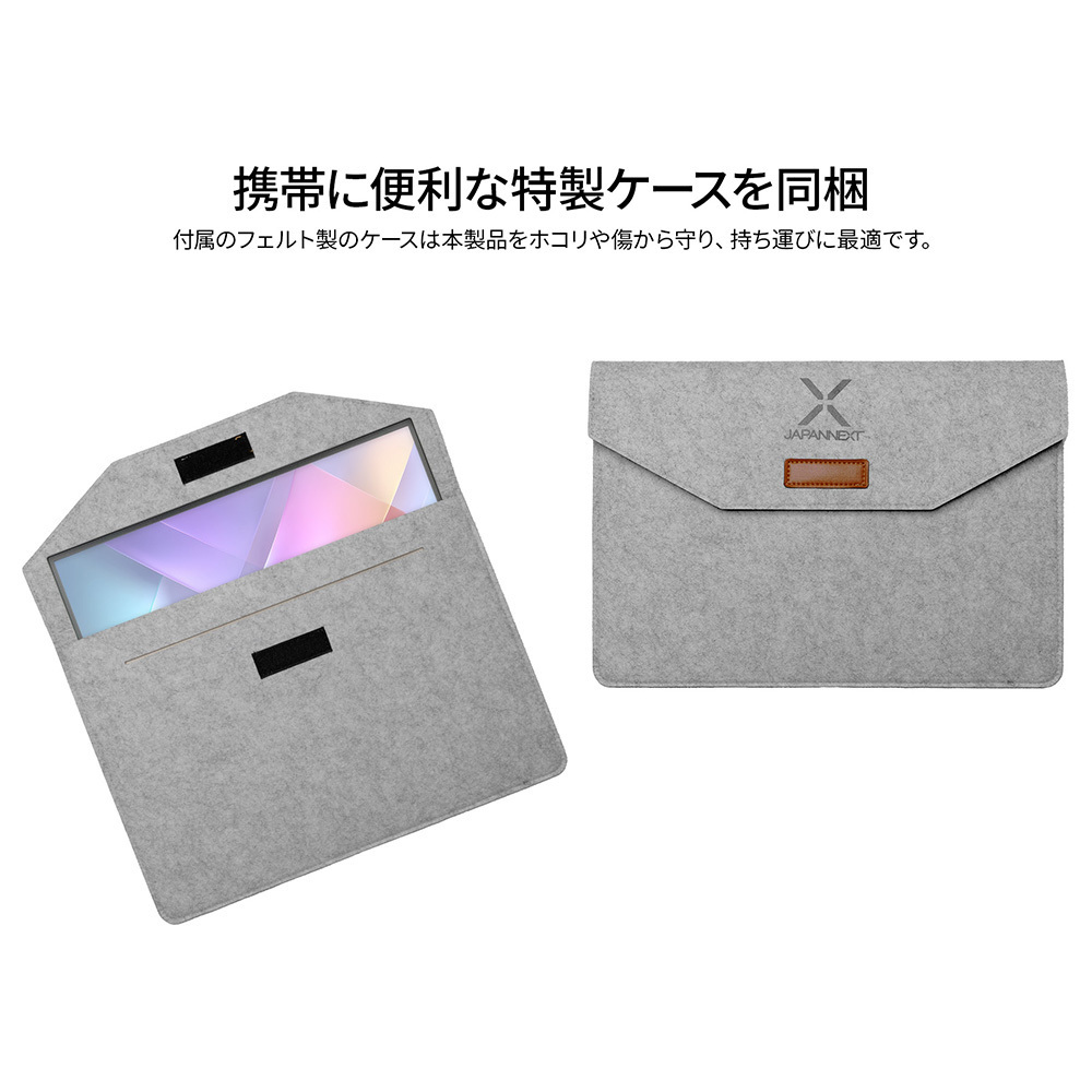 モニター背面にキックスタンドを搭載しているので自立して使用することができ、どこでもデュアルディスプレイ環境の構築が可能です。また、携帯時に便利なフェルトケースを同梱。製品本体をホコリや傷から守り、持ち運びに最適です。
