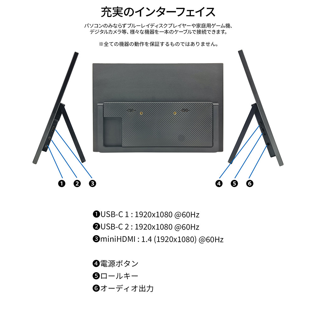 | 入出力端子 | miniHDMI 1.4×1 (60Hz) USB-C×2 (60Hz) オーディオ出力×1 |