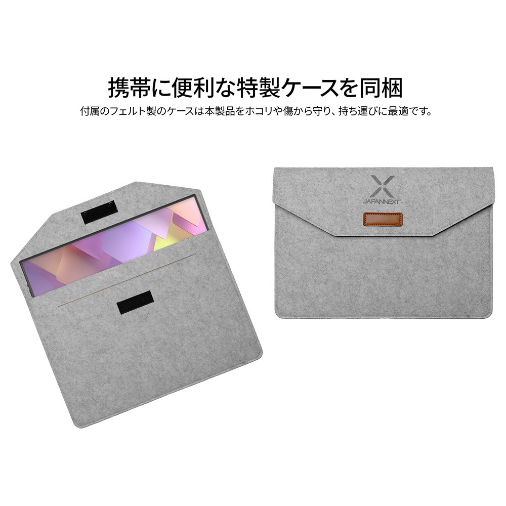 モニター背面にキックスタンドを搭載しているので自立して使用することができ、どこでもデュアルディスプレイ環境の構築が可能です。また、携帯時に便利なフェルトケースを同梱。製品本体をホコリや傷から守り、持ち運びに最適です。