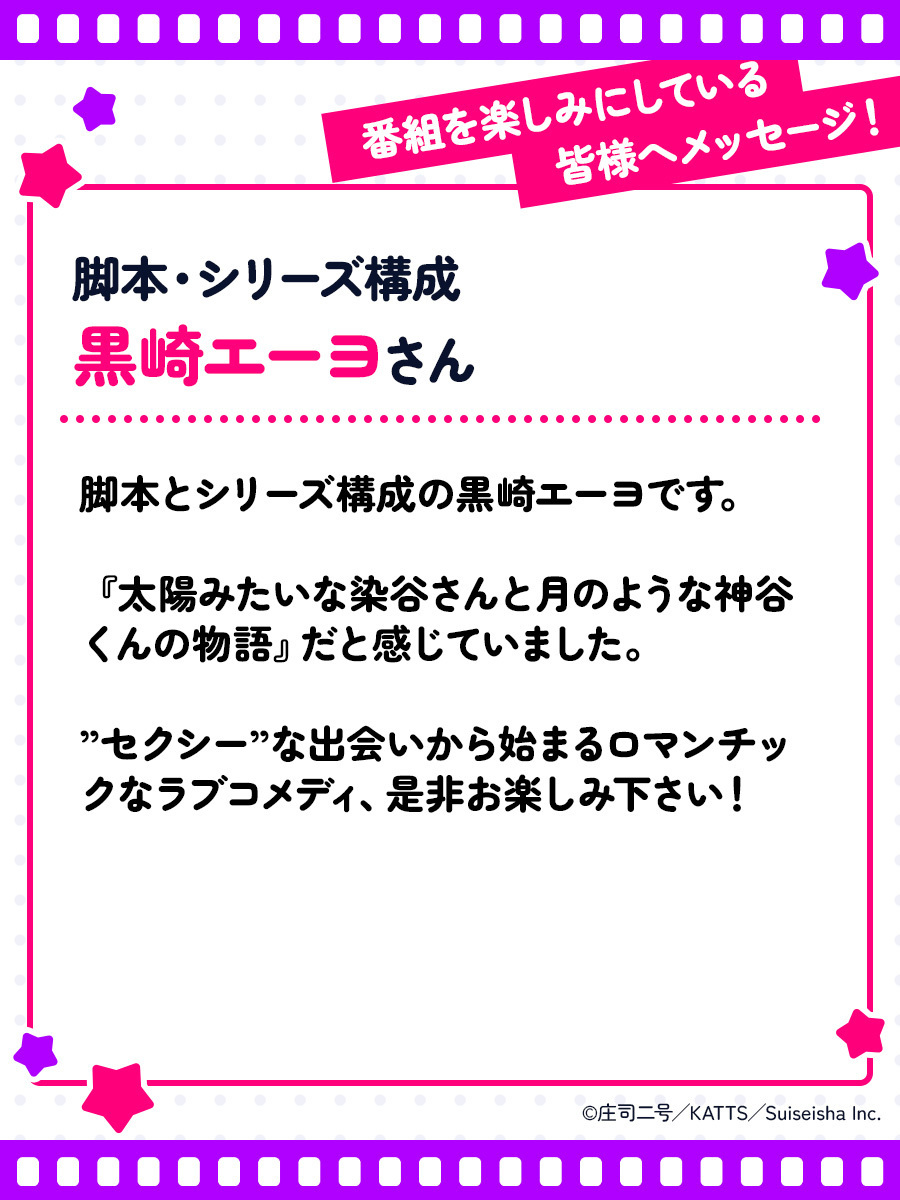 脚本とシリーズ構成の黒崎エーヨです。『太陽みたいな染谷さんと月のような神谷くんの物語』だと感じていました。”セクシー”な出会いから始まるロマンチックなラブコメディ、是非お楽しみ下さい!